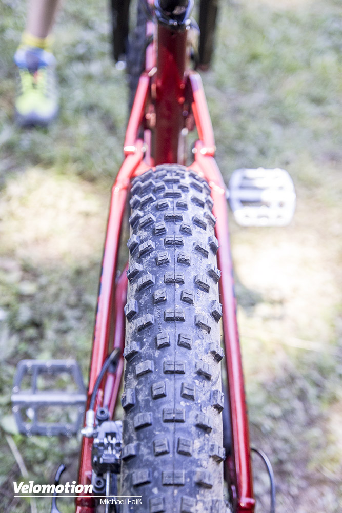 Viele schlagen nun wohl (zumindest in Gedanken) die Hände vor’s Gesicht und denken an den Rollwiderstand, der sich bei einer solchen Bereifung natürlich erhöht. Nun, es mag stimmen, dass er Rollwiderstand steigt, doch tut er dies in einem weitaus geringeren Maß, als man auf den ersten Blick vermuten würde, vor allem in ruppigem Gefilde. Fährt man beispielsweise über einen Trail mit vielen Wurzeln, schluckt der dicke Reifen durch das große Volumen und den niedrigen Druck die Hindernisse, während ein schmaler, härter aufgepumpter Reifen tendenziell davon abprallt und so erst für Widerstand sorgt. So halten sich die Vor- und Nachteile solcher Reifen je nach Beschaffenheit des Untergrunds in Puncto Rollwiderstand die Waage. Das Gewicht der Laufräder und der Reifen steigt natürlich ebenfalls – das Rad wird tendenziell etwas träger und benötigt mehr Überzeugungskraft beim Beschleunigen.