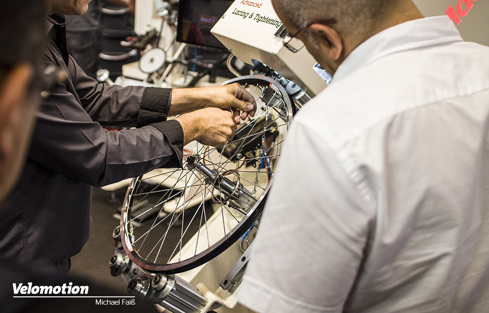 Von den Reifen zu den Laufrädern: Am Stand von Mach1 konnte man eine halbautomatische Einspeichmaschine bei der Arbeit beobachten.