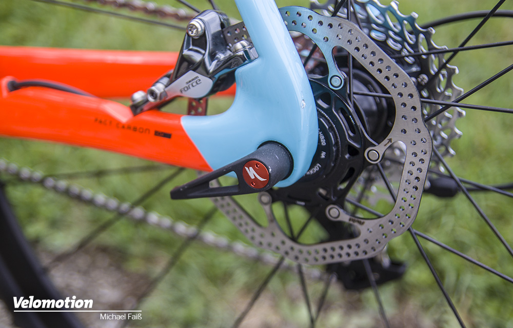 … denn hier setzt man jetzt bei Specialized sowohl an Vorder- als auch Hinterrad auf Steckachsen. Das erhöht die Steifigkeit und erleichtert die Justage der Scheibenbremsen enorm.