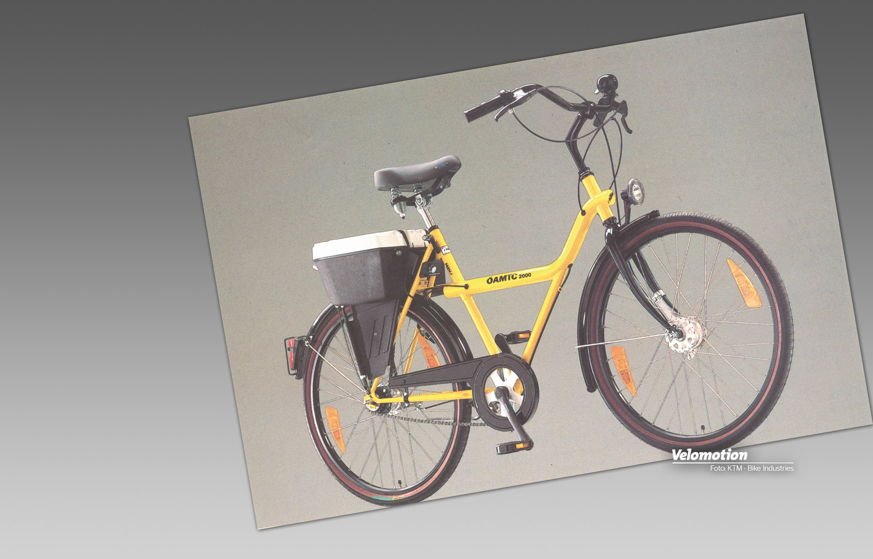 Bereits 1994 wagte man sich bei KTM auf das Gebiet der E-Bikes. Für den österreichischen Automobilclub ÖAMTC baute man das erste E-Bike in der Geschichte des Unternehmens. Der Antrieb hatte mit denen moderner Pedelecs nicht viel gemein: Motor und Akkus saßen in einer Art Gepäckträger aus Kunststoff im hinteren Bereich des Spezialrahmens. Die Kraftübertragung erfolgte über eine zweite Antriebskette, die an einem zweiten Ritzel an der Spezialnabe angelegt wurde. Ein spezieller Kettenspanner sorgte dafür, dass der Antrieb immer wie gewünscht funktionierte, auch nachdem sich die Kette gelängt hatte. Der Motor selbst lieferte 180 Watt und die beiden 10Ah Akkus lieferten Energie für ca. 25km. Über einen Drehgriff wurde die Stärke der Unterstützung stufenlos reguliert. Knapp 20.000 Schilling bzw. 1.450€ kostete das ÖAMTC 2000 damals.