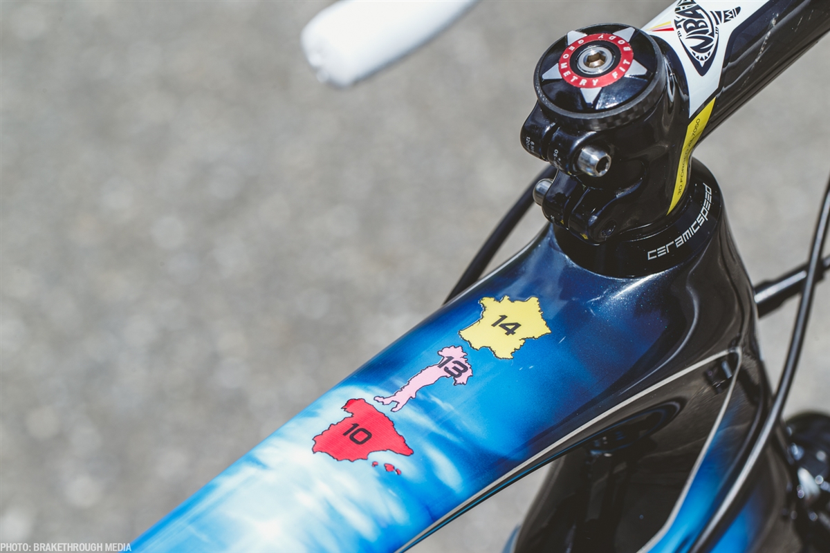 Also ständige Motivation prangern die drei größten Karriereerfolge Nibalis auf dem Oberrohr: Siege bei der Vuelta (2010), beim Giro (2013) und der Tour de France (2014)