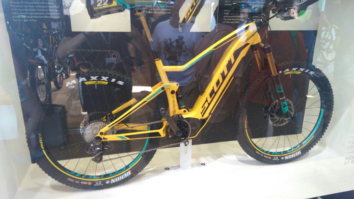 Bei Scott lässt sich hinter einer dicken Glasscheibe ein neues E-MTB mit 130/120mm bestaunen. Das Rad kommt mit dem neuen Shimano E8000 Antrieb und passender XT Di2 Schaltung.