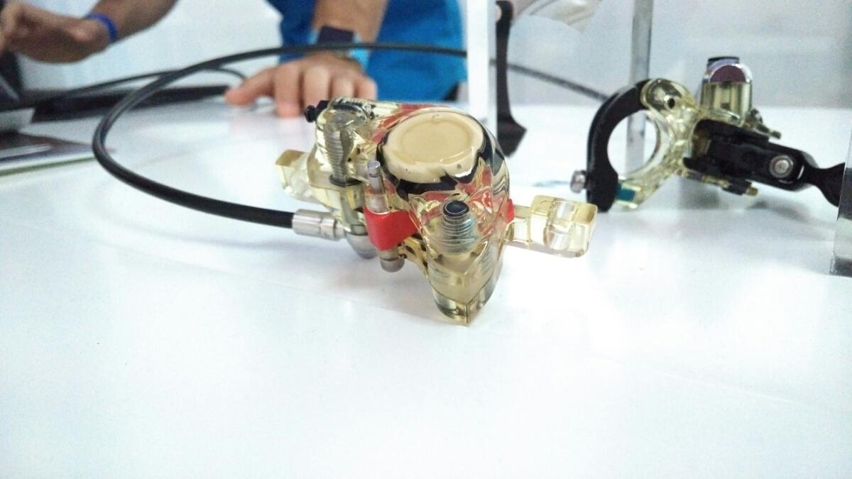 Transparenter Bremssattel am Stand von Shimano – wir fänden ja auch eine Serienversion super…