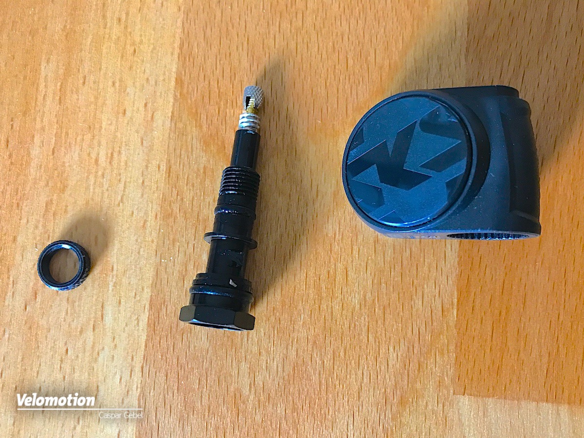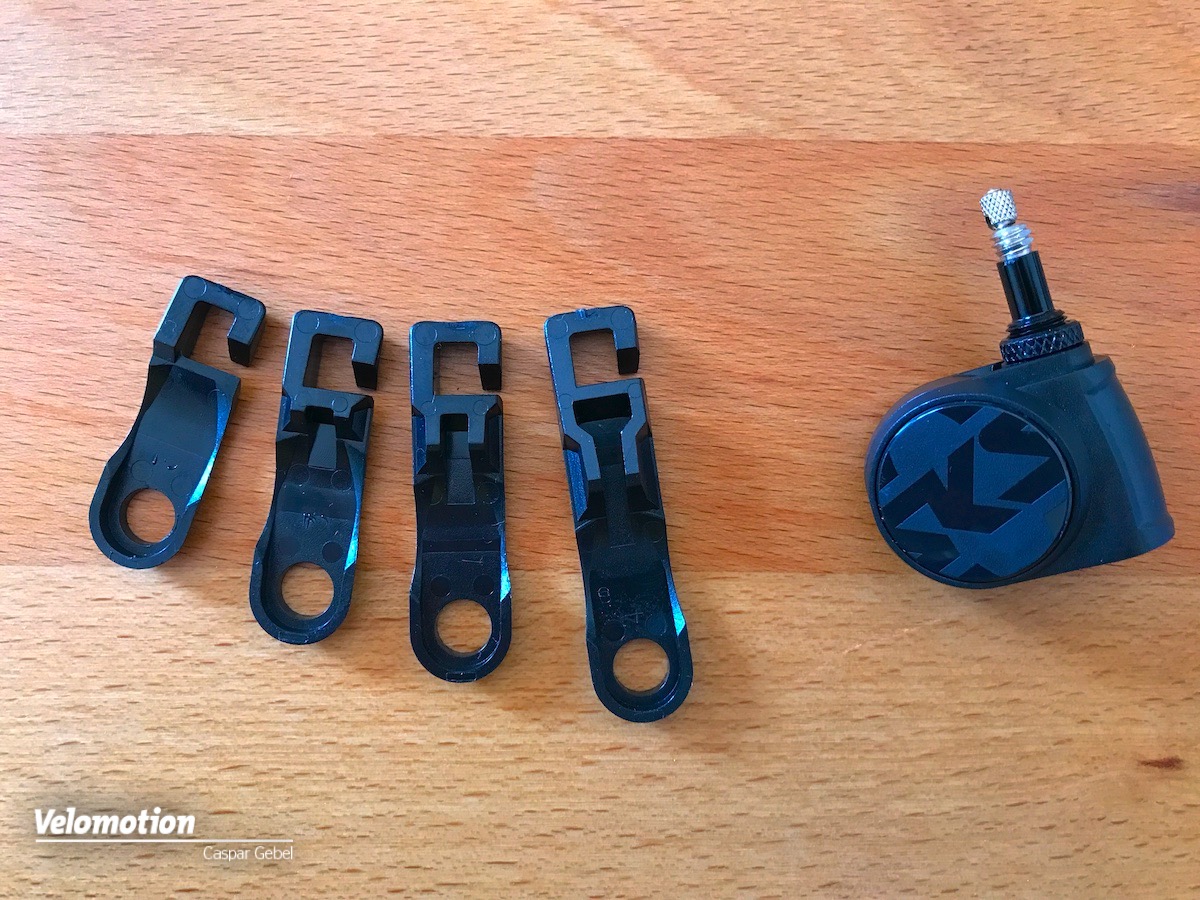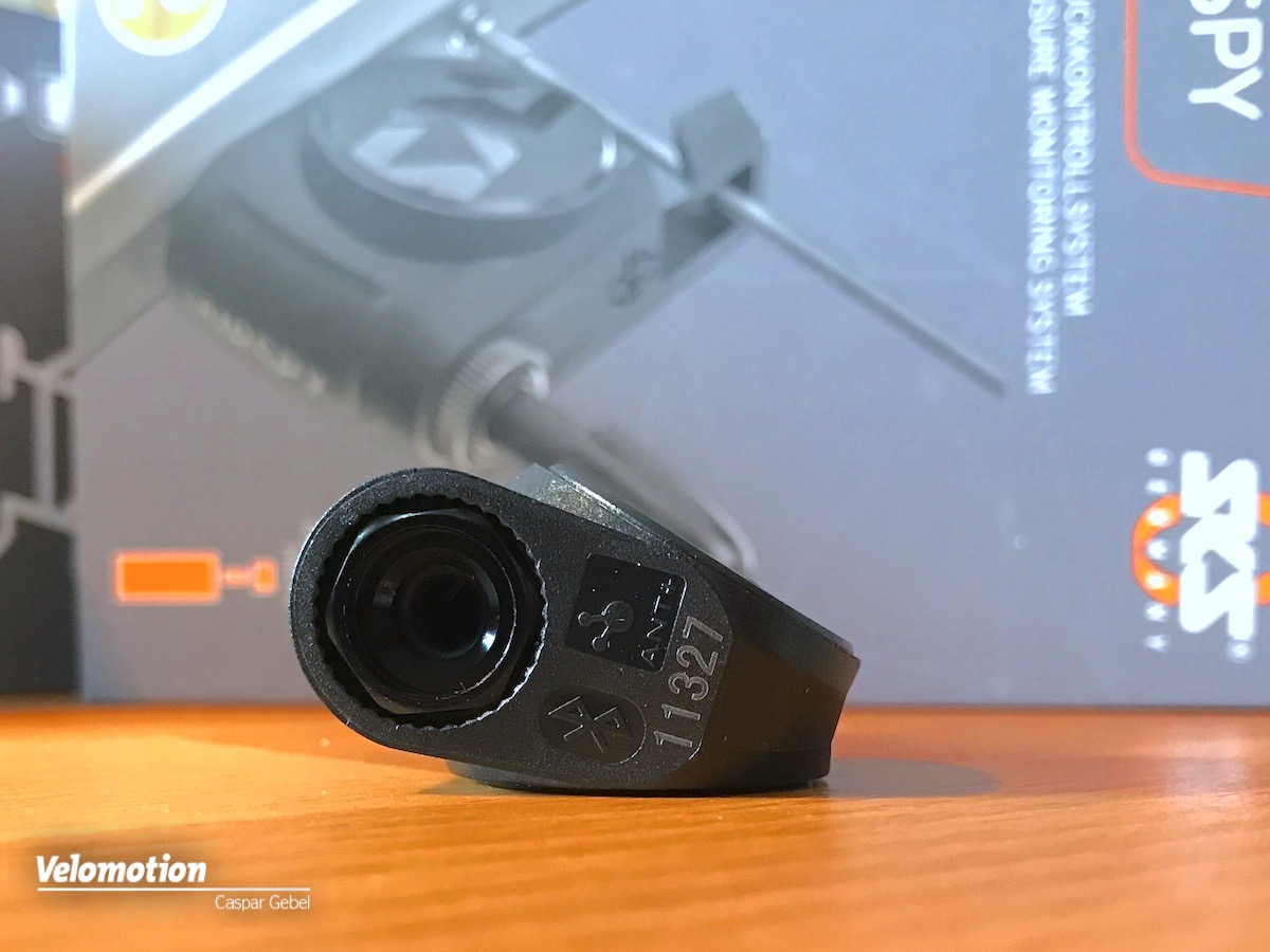 Klassiker der Luftdruckmessung ist die Daumenprobe an der Lauffläche, doch das ist zum einen nicht sehr genau, zum anderen muss man es halt auch machen. Auch probeweise die Standpumpe mit Manometer anzusetzen, wird vielen nicht regelmäßig in den Sinn kommen. Und so hat Pumpenspezialist SKS ein Gerät entwickelt, das eine permanente Luftdruckmessung erlaubt – den Airspy. Der kompakte Messfühler, der sich recht unauffällig am Laufrad montieren lässt, besteht im Wesentlichen aus zwei Teilen: einer Alu-Hülse, die auf den Ventilschaft geschraubt wird, und der darauf gesteckten Messeinheit inklusive Knopfzelle. Das Ventil des Reifens (ob Ventil des Schlauchs oder Tubeless-Ventil) verbleibt im Ventilschaft, muss aber geöffnet sein; beim Aufschrauben der Hülse entweicht deshalb erst einmal die Luft aus dem Pneu. Das Aufstecken der Messdose dichtet die Einheit ab; nun wird noch ein Speichenhalter in passender Länge ausgesucht und aufgesteckt, eine Rändelmutter sichert das Ganze.