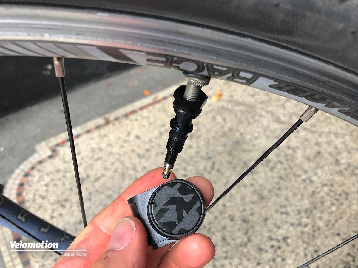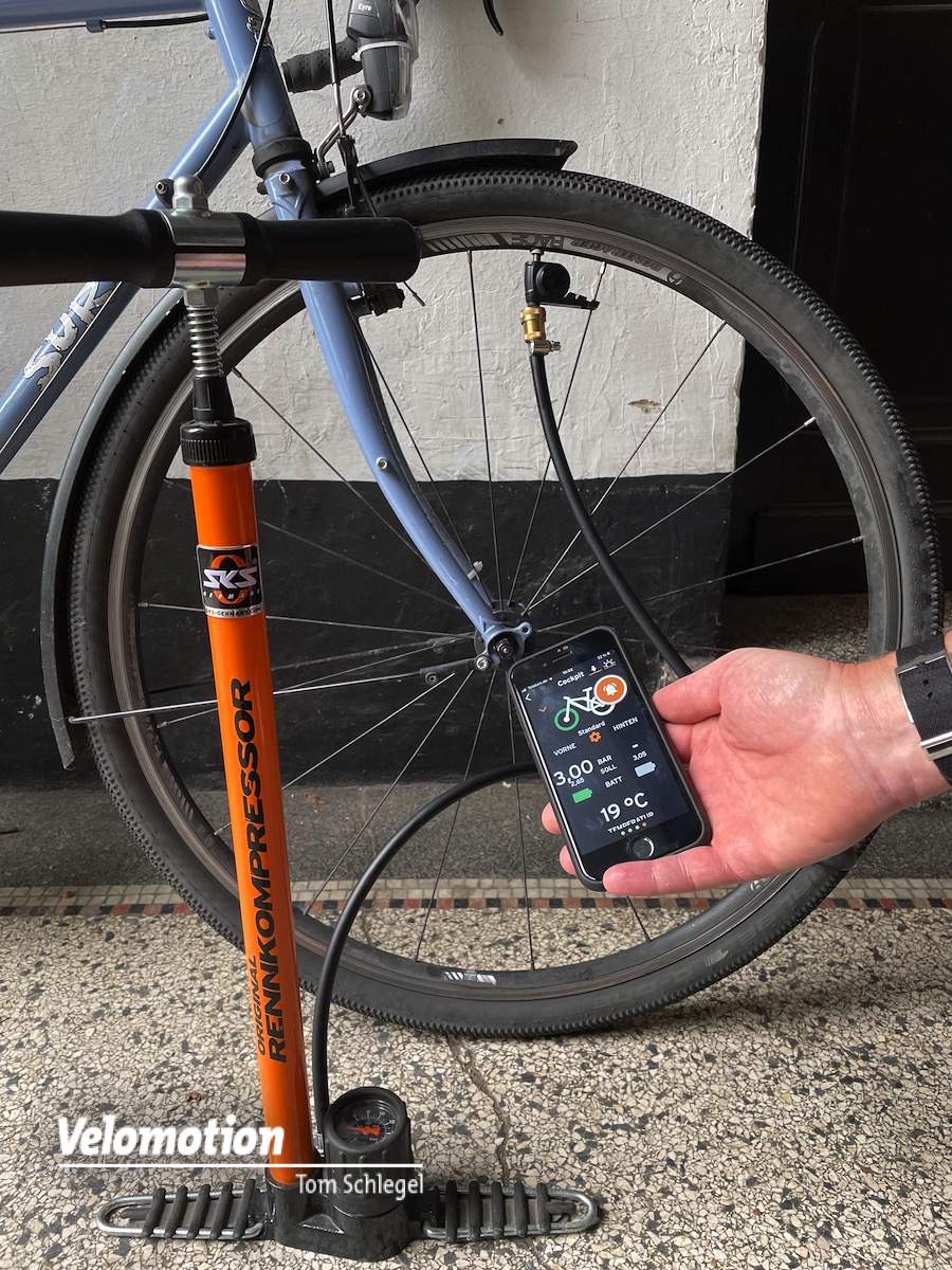 Den Sensor per Bluetooth zu verbinden ist ziemlich einfach; alternativ geht’s auch per ANT+, was dann hilfreich ist, wenn man die Luftdruckmessung etwa per Garmin-Radcomputer abrufen möchte. Aktiviert wird die Verbindung zum Empfangsgerät, sobald das Laufrad mit dem Airspy bewegt wird, ansonsten wäre die Batterie ziemlich schnell leer. Wer sein Smartphone nicht gerade am Lenker montiert hat, muss vorm Losfahren also kurz beide Laufräder rotieren lassen, um die Sensoren zu aktivieren. Wird dann zu geringer Druck angezeigt und man greift zur Standpumpe, lässt sich der Druckaufbau in Echtzeit verfolgen – außerdem zeigt sich, dass der Redaktions-Rennkompressor in Rahmen der Ablesegenauigkeit ziemlich exakt den Druck anzeigt.
