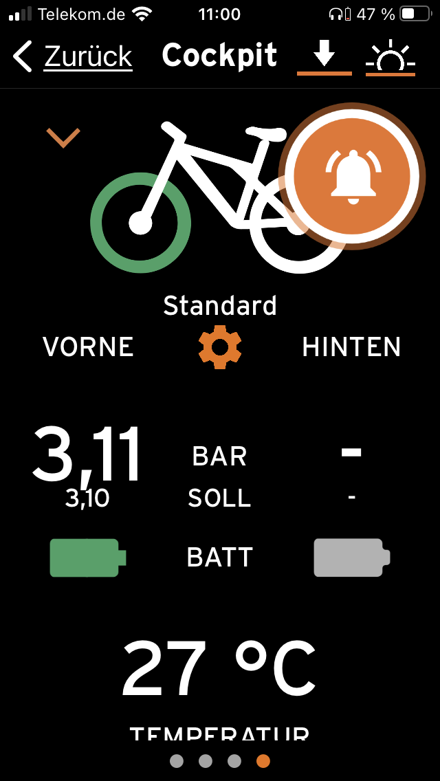 Fehlt nur noch eine App, um die Messergebnisse anzuzeigen, und die hat SKS natürlich auch. Wobei die Druckmessung nur ein Aspekt der „MyBike“-App ist – sie dient auch zur Navigation und zum Aufzeichnen von Touren, außerdem kann man einen digitalen Fahrradpass erstellen und diesen etwa mit einem Händler teilen, sodass dieser alle Daten des betreffenden Kunden und Fahrrades parat hat. Dazu zeigt der Bildschirm der App einen Glocken-Button, bei dessen Berührung das Smartphone ein schepperndes Klingelgeräusch von sich gibt.