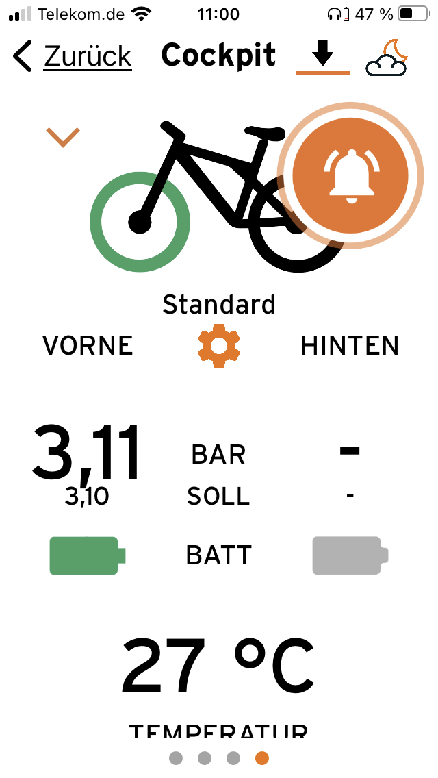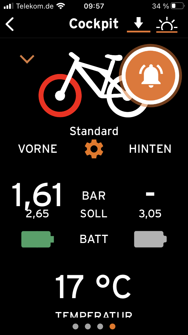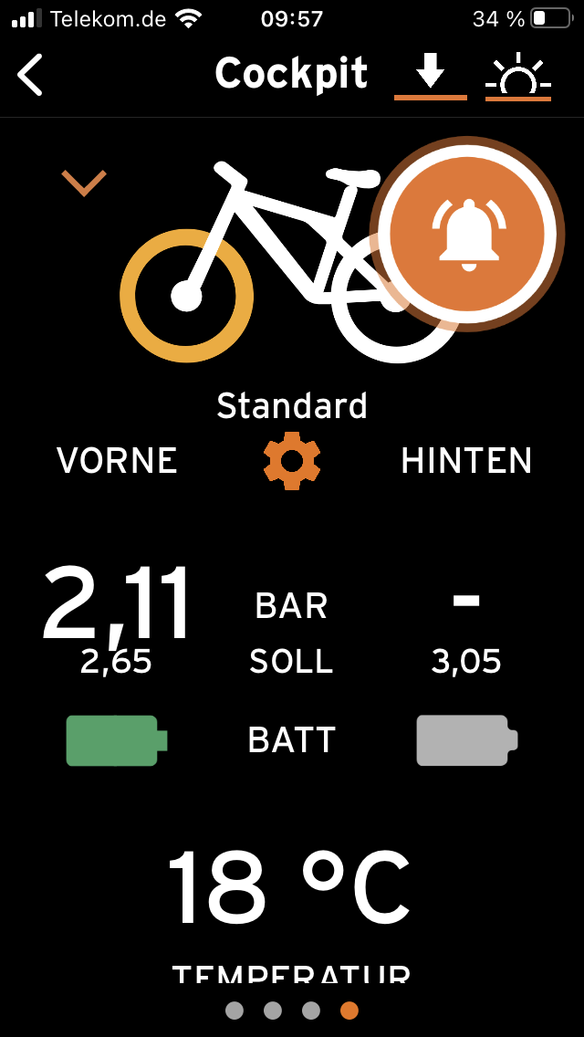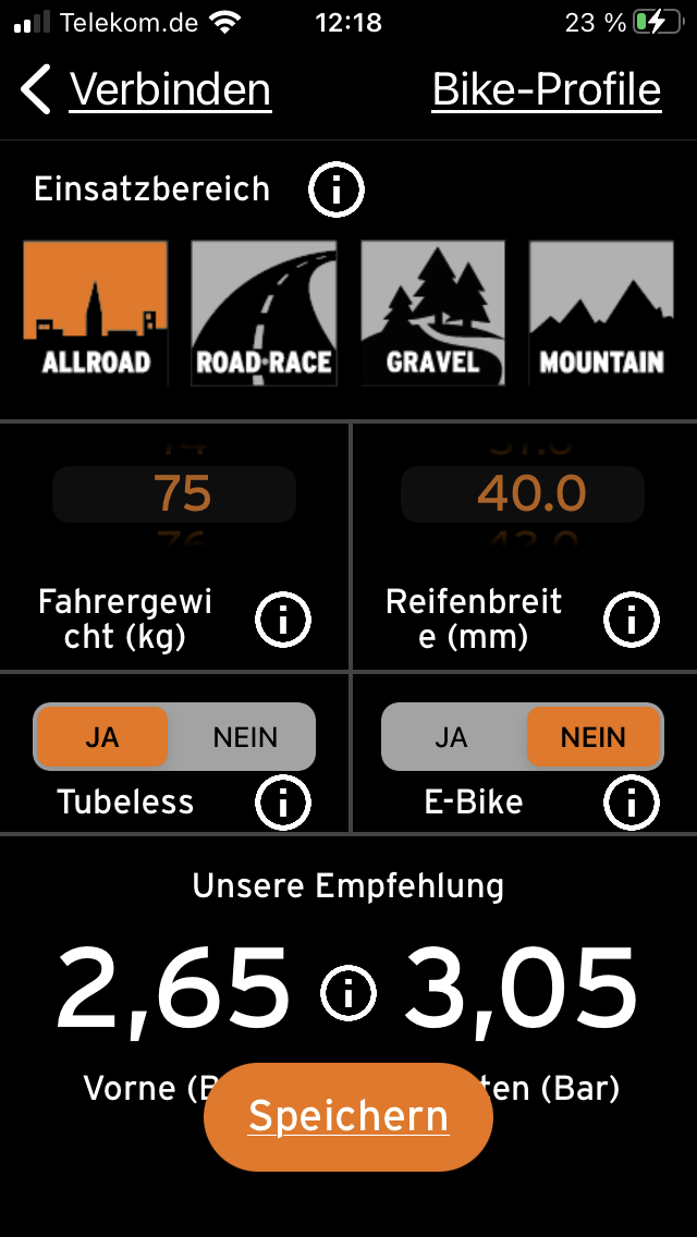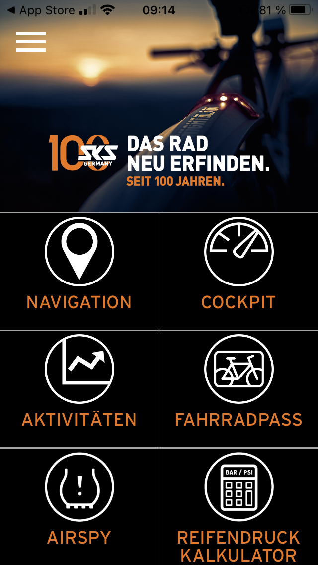 Und nicht zuletzt hat SKS einen „Reifendruckkalkulator“ programmiert, der nach Eingabe von Einsatzbereich, Fahrergewicht und Reifenbreite eine Druckempfehlung abgibt. Auf dem Handybildschirm geben Farbmarkierungen an, ob der jeweilige Reifen ausreichend belüftet ist, außerdem zeigt eine Warnmeldung zu geringen Druck an. Auch der Batteriestand wird angezeigt.