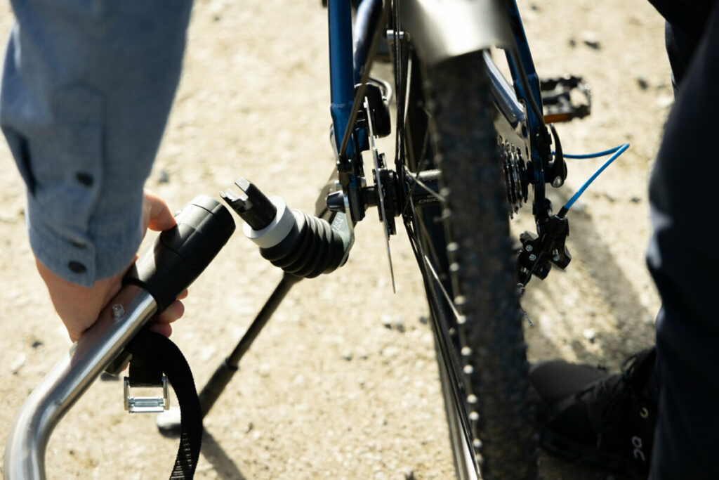 Die Räder können mit einem Handgriff abgenommen werden und lassen sich am Bodenblech festmachen. Wenn man den Anhänger dann verräumen möchte dann ist er nur knappe 35 Centimeter hoch. Dazu ist er auch gerade mal um die zehn Kilo schwer. Wenn man in der Stadt wohnt und das Teil in den Keller oder die Wohnung gebracht werden muss, dann sind das kompakte Maß und das niedrige Gewicht wichtig. Weil wir gerade beim Gewicht sind, 45 Kilo dürfen zugeladen werden, das ist ordentlich. Der Hautoo ist serienmäßig auf Fahrräder von 26 bis 29 Zoll ausgelegt, dazu ist die Deichsel verstellbar, aber es gibt auch Lösungen für kleine Radgrößen.