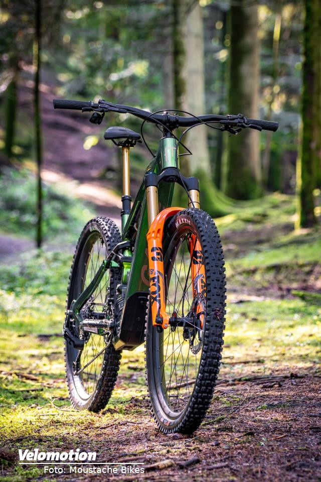 - Laufräder: Moustache, asymmetrisch, Just-Carbon, 28 Loch, 29’’, Innenbreite 31 mm, montiert mit Tubeless-Ventilen und -Flaps, Dreifachspeichen, Aluminium Sicherungsmuttern
