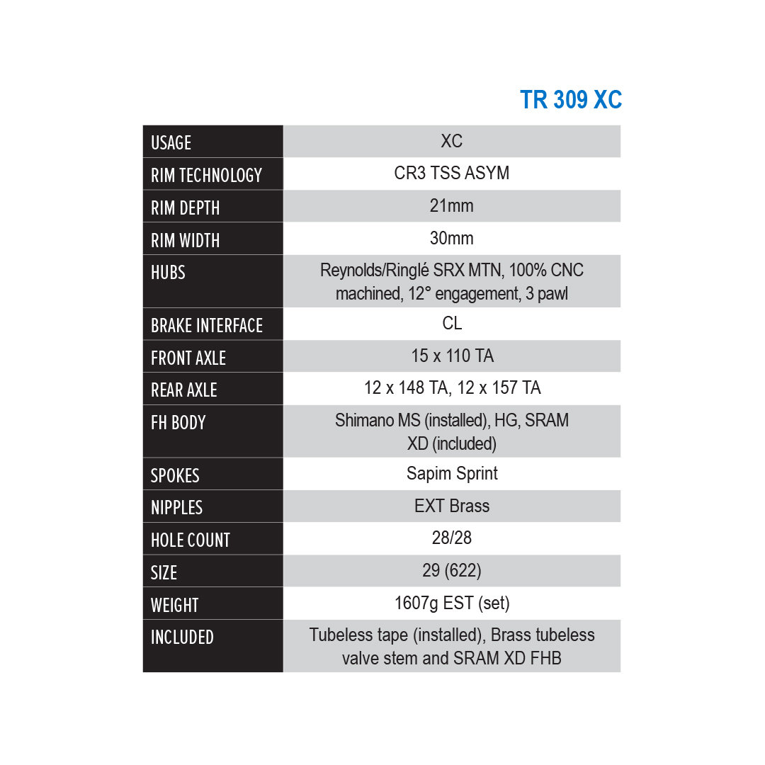Blacklabel 309 XC Pro richtet sich an Fahrer, die das leistungsstärkste XC-Laufrad suchen, das Reynolds je entwickelt hat. Features sind die Carbon-Konstruktion der nächsten Generation, das 30-mm-TSS-Profil und Solix-Naben für verzögerungsfreie Beschleunigung. Blacklabel 309 XC Expert bietet rennsporterprobte Carbon-Technologie mit Ringle Super Bubba X-Naben und dem gleichen Profil und MR5-Layup der Pro-Version. Das TR 309 XC verfügt über die gleiche fortschrittliche Felgenform wie die Blacklabel-Modelle, mit Reynolds x Ringle SRX-Naben und ausgewogener Speichenarchitektur – für Fahrer, die sich ein authentisches Renngefühl mit echter Belastbarkeit wünschen.