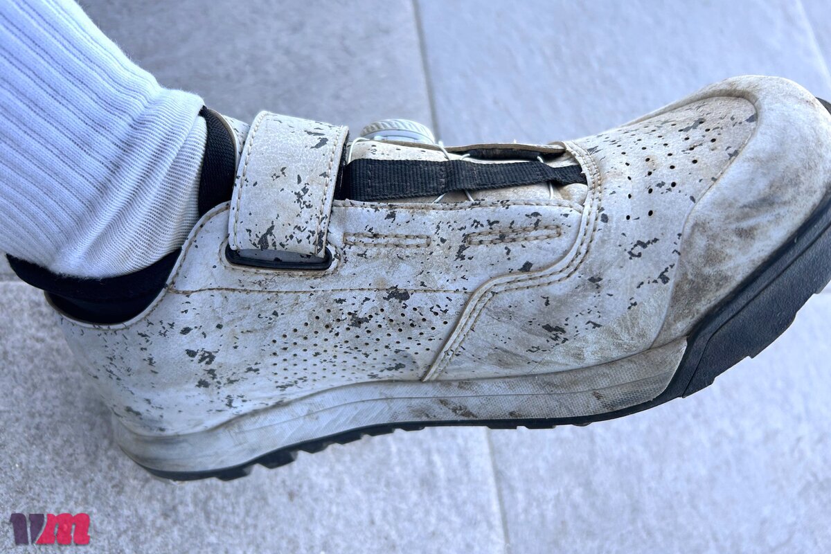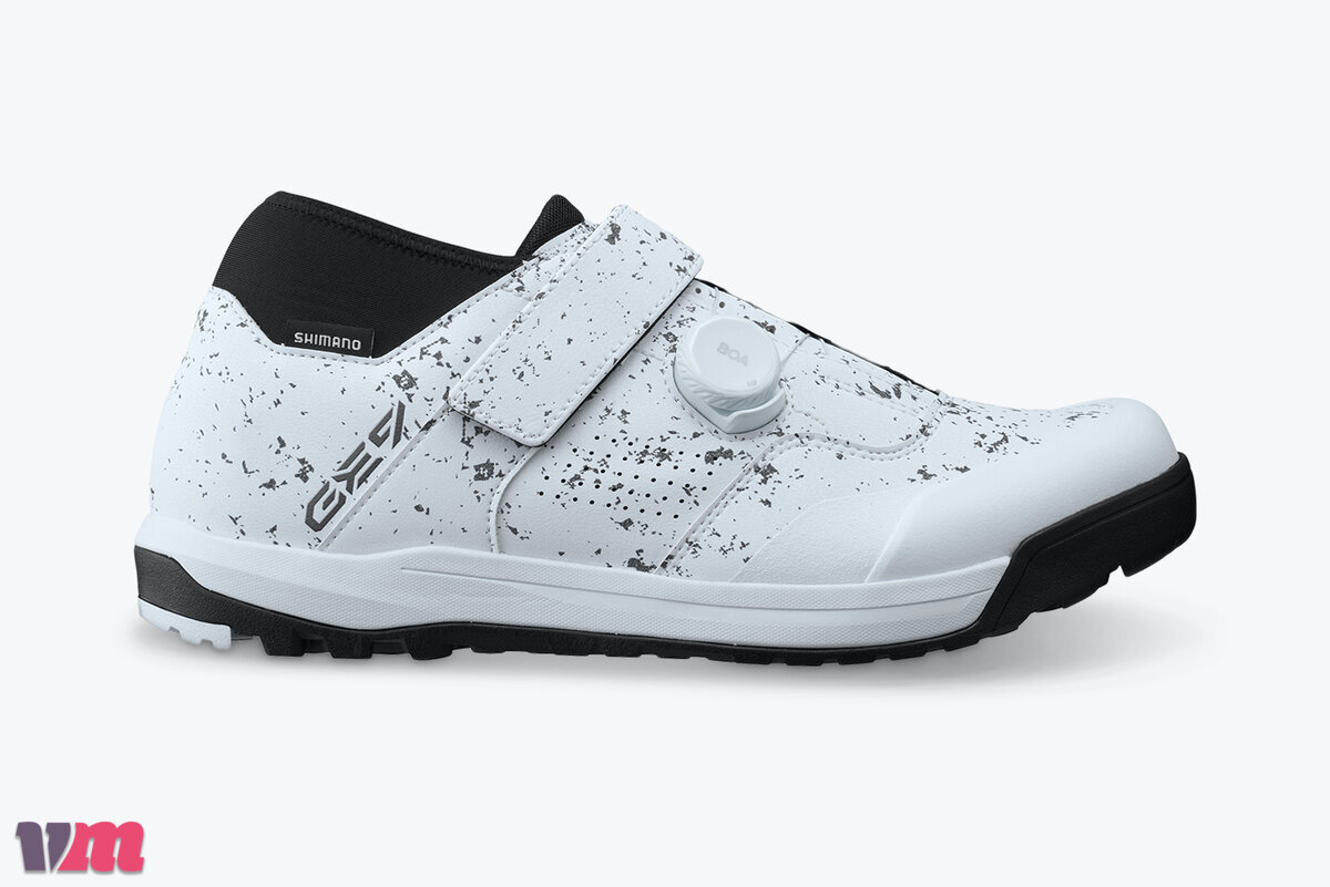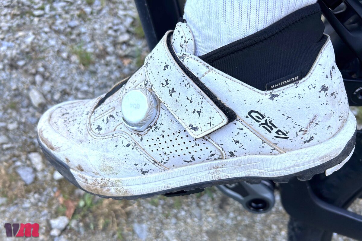 Für festen Halt am Fuß sorgen ein Klettriemen sowie ein „BOA Li2“-Drehverschluss. Dies ist eine sinnvolle Kombination, die potenzielle Druckstellen vermeidet und einfach bedienbar ist. Auch dem Preis der Schuhe ist das System angemessen: 219,95 Euro ruft Shimano für den in Schwarz und Weiß verfügbaren GE900HS auf, was nicht sehr teuer dafür ist, wie hoch das Downhill-Modell in der Produkthierarchie angesiedelt ist. Mit dem GE900W gibt es übrigens ein frauenspezifisches Schwestermodell, das neben dem schönen Blauton einige konstruktive Besonderheiten aufweist.