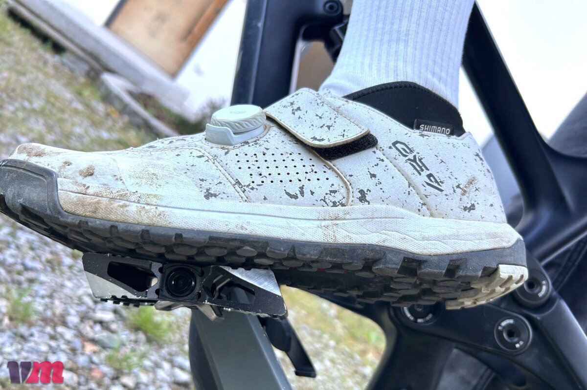 Wer mit MTB-Schuhen eine stark profilierte Sohle mit Schraubstollen verbindet, muss in Sachen Downhill und Enduro natürlich umdenken. Der GE900HS ist auf Plattformpedale à la Shimano XTR Enduro abgestimmt bzw. auf Flatpedale mit Pins und weist daher eine große Auflagefläche mit integrierter Rinne für die SPD-Cleats auf. Letztere sind über einen großen Bereich verstellbar. Gehpassagen sind mit der griffigen Gummierung angenehm, und die tieferen Rinnen im Bereich von Zehen und Ferse sorgen für genug Grip, wenn das Bike mal geschoben werden muss – selbst in steilem Gelände.