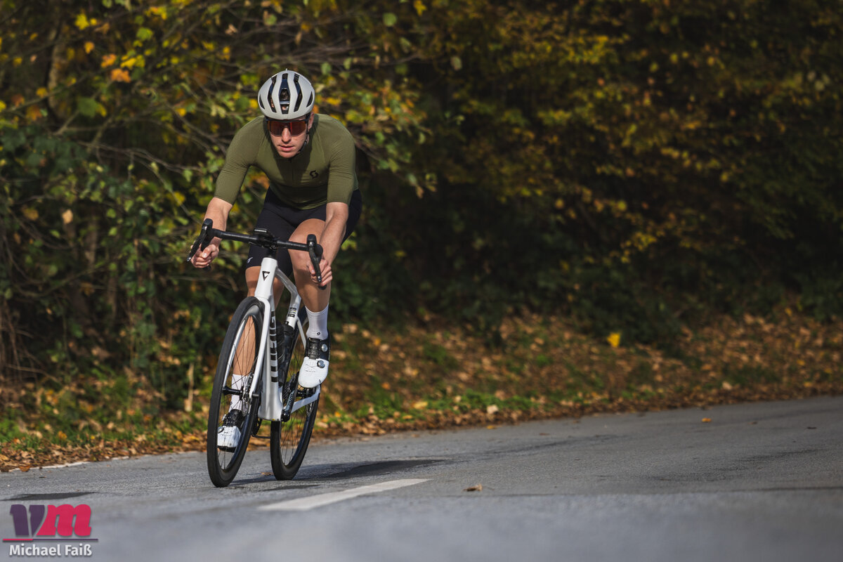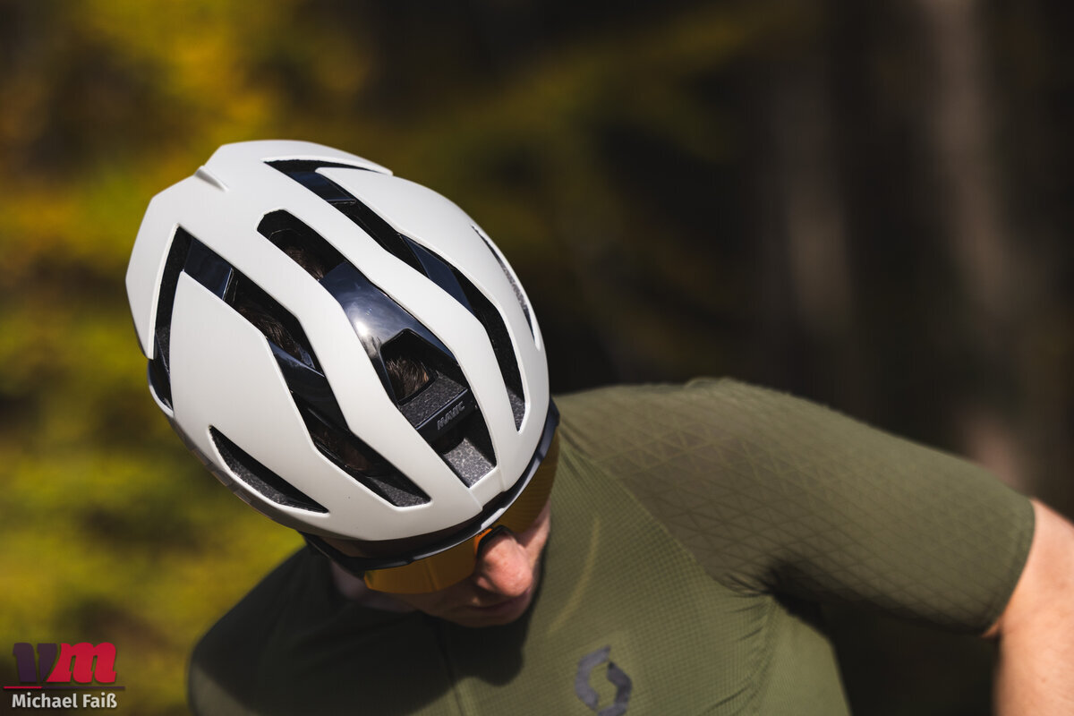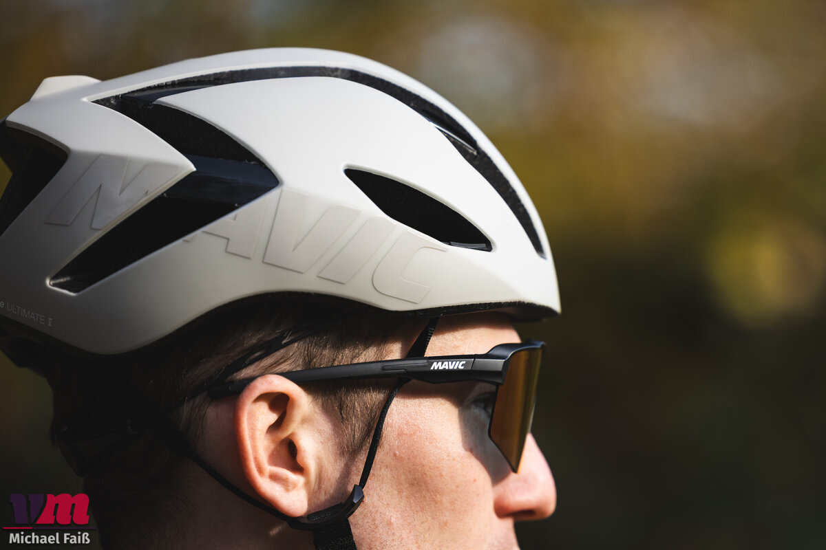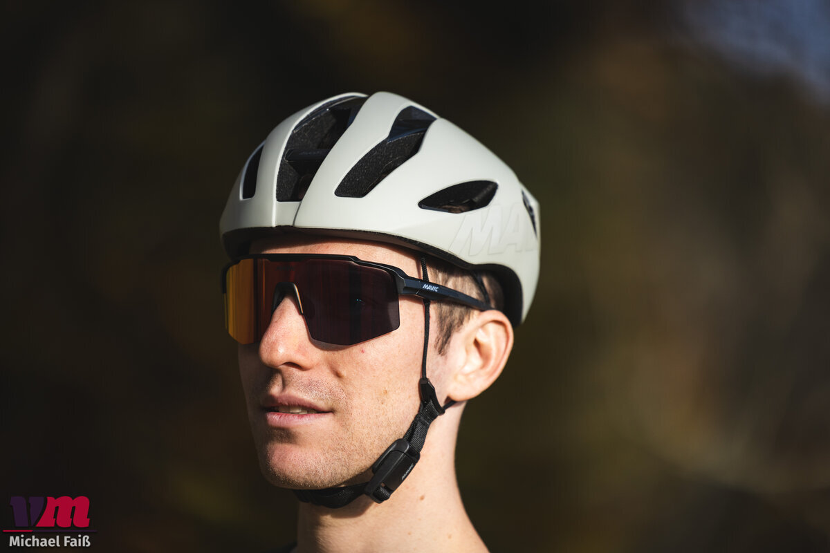 Natürlich haben wir uns die Zeit genommen, uns den Mavic Comete Ultimate 2 in Kombination mit der MVS Shield Brille auf diversen Ausfahrten näher anzusehen. Schon von Anfang an wird klar, dass sich hier ein schlüssiges Duo ergibt und Helm sowie Brille perfekt aufeinander abgestimmt sind und in Kombination eine gute Passform bieten. Die Bänder und der Befestigungsmechanismus des Helms kommt so mit den Bügeln der Brille nicht in Konflikt, was häufig zu unangenehmen Druckstellen oder einem Verrutschen von Helm oder Brille sorgt.