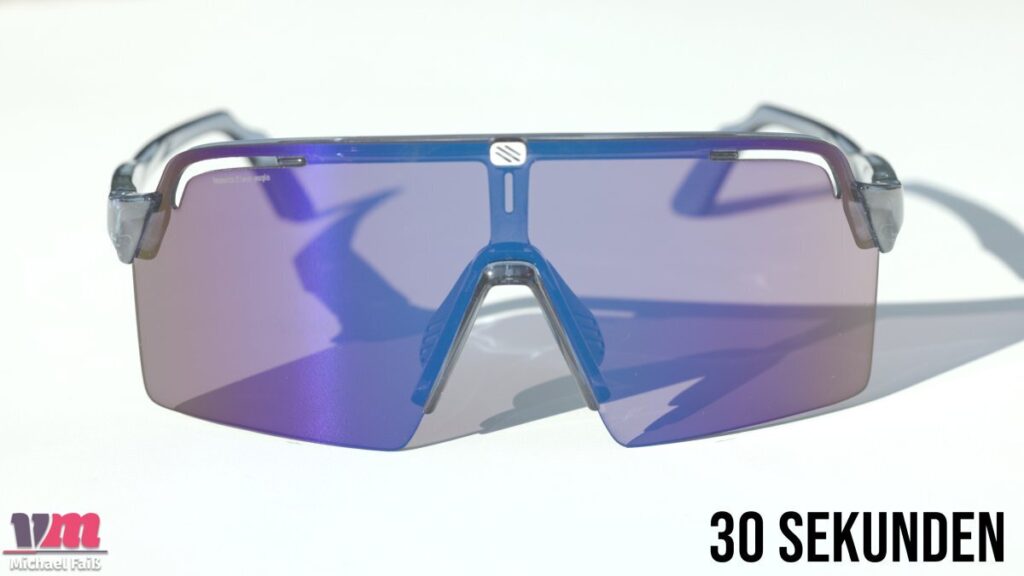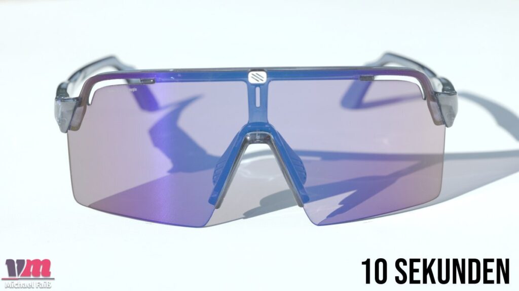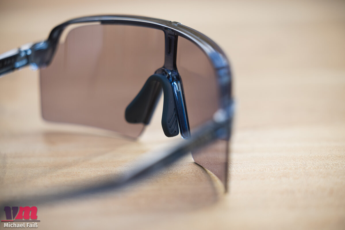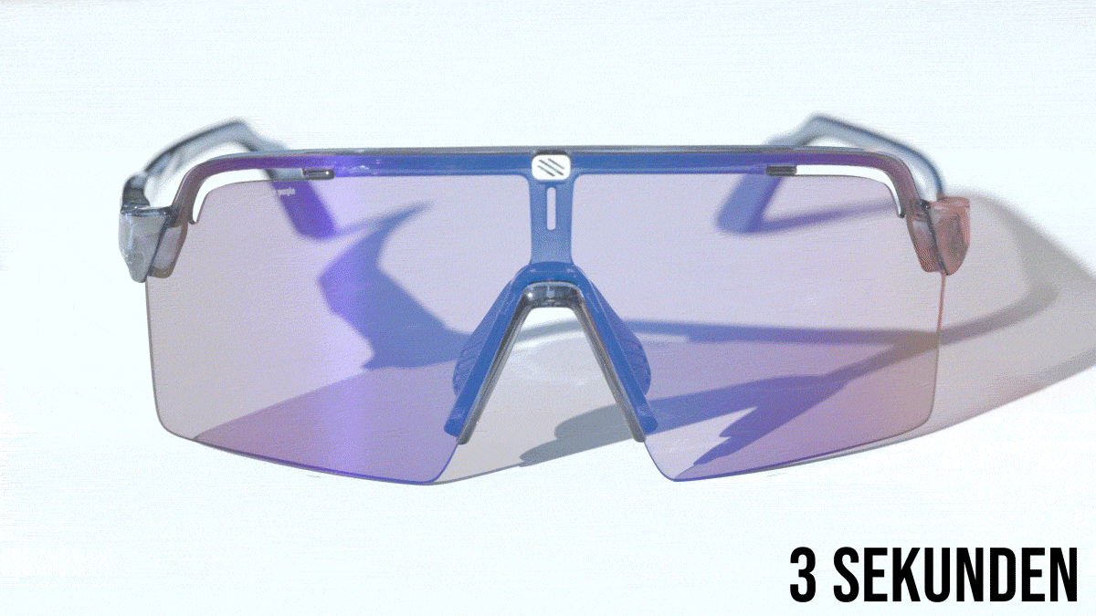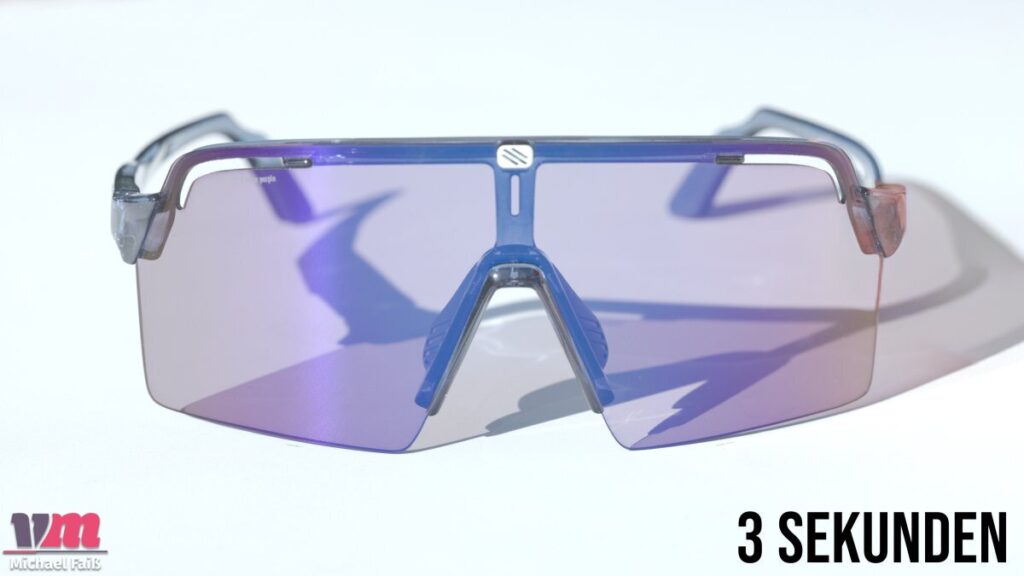 Herzstück der Brille ist das photochrome „ImpactX 2 Laser Purple“-Glas. Es deckt einen VLT-Bereich (Visible Light Transmission) von 8 % bis 48 % ab und fällt damit in die Schutz-Kategorien 2 bis 3. Hier zeigt sich die klare Ausrichtung der Brille: Mit einer maximalen Aufhellung von 48 % ist sie kein Spezialist für dämmrige Waldpassagen oder trübe Wintertage. Sie bleibt tendenziell eher dunkel und spielt ihre Stärken an sonnigen Tagen aus, an denen sie zuverlässig vor gleißendem Licht schützt. Das unzerbrechliche ImpactX 2-Glas reagiert dabei blitzschnell auf wechselnde Lichtverhältnisse. Die leichte violette Tönung sorgt im Wald für angenehme Kontraste, ohne die Farbwahrnehmung zu stark zu verfälschen.