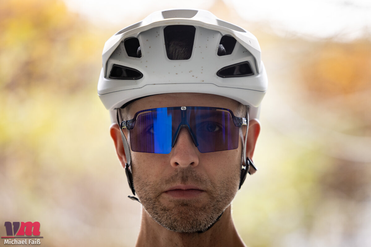 Einmal aufgesetzt, ist die Spinshield Pro eine Macht. Das riesige Panorama-Glas bietet ein schlichtweg überragendes Sichtfeld – komplett uneingeschränkt, da kein Rahmen die periphere Sicht stört. Dadurch ist auch der Windschutz exzellent und gehört zum Besten, was wir im Test erlebt haben. Trotz der großen Abdeckung sorgt das „Vent Controller“-System, also gezielte Belüftungsöffnungen, für eine sehr gute Luftzirkulation, die ein Beschlagen der Scheibe effektiv verhindert. Auch die hydrophoben Eigenschaften überzeugen: Schweiß und Spritzwasser perlen anstandslos ab, und die Brille ließ sich unterwegs kinderleicht reinigen. Der Sitz ist auch auf ruppigen Trails sicher, obwohl wir uns für den perfekten Halt eine etwas großzügigere Gummierung an den Bügelenden gewünscht hätten, die noch etwas weiter nach vorne reicht.