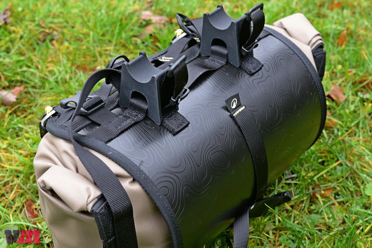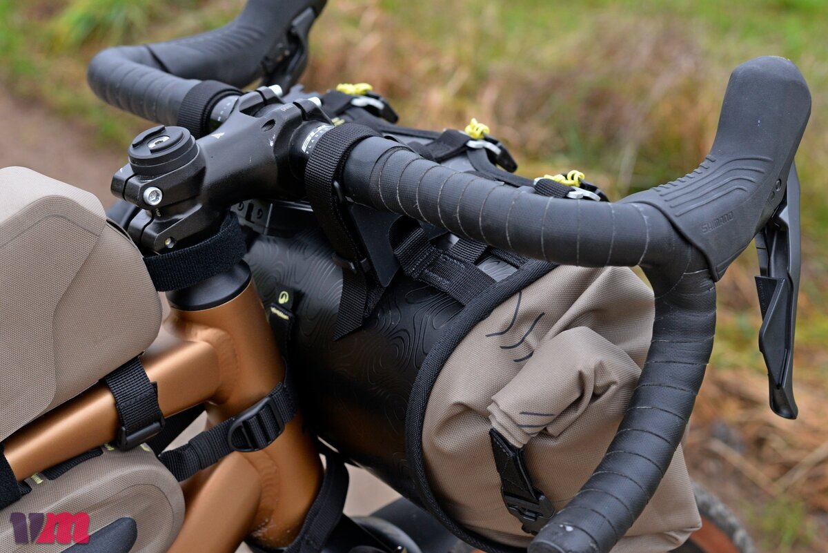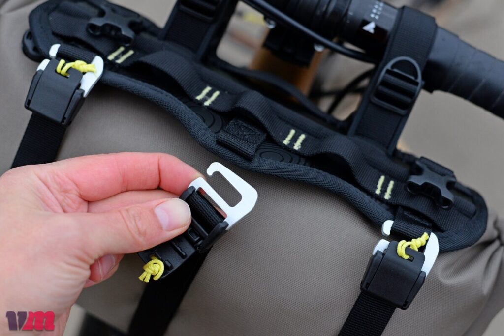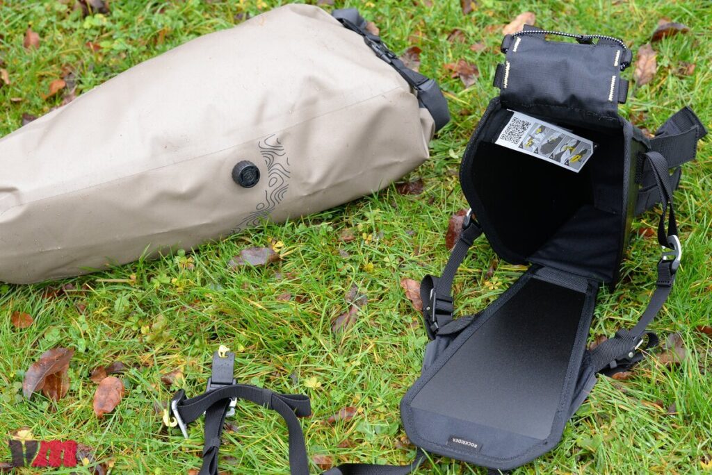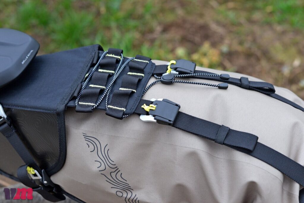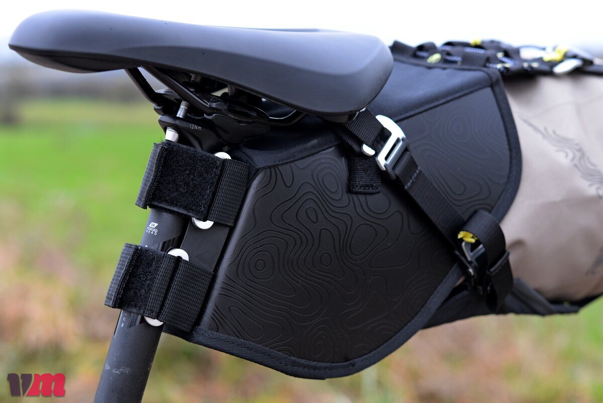 Wie bei der Lenkertasche besteht die Satteltasche aus zwei separaten Komponenten: Halterung und Packsack, beide müssen einzeln erworben werden. Die Halterung ist aus robustem, widerstandsfähigem Material gefertigt und massiv konstruiert, wodurch das Gewicht zwar etwas höher ausfällt, die Stabilität aber deutlich im Vordergrund steht. Besonders ins Auge fällt der Befestigungspunkt an der Sattelstütze: Durch einen Gummiblock geführt, fixieren zwei doppelt ausgelegte Klettbänder in Kombination mit massiven Metallösen die Tasche bombenfest am Sattel. Das ist sicher, aber nicht unbedingt leichtgewichtig. Der Packsack lässt sich ähnlich wie beim Lenkersack gut komprimieren und bietet genug Platz, um ordentlich Material zu verstauen. Praktisch ist das kleine Netz auf der Oberseite, das schnellen Zugriff auf Kleinteile erlaubt. Beim Handling können die Metallhaken wieder zum Nadelöhr werden: Mal lassen sie sich problemlos durch die Ösen ziehen, mal hakt es etwas, was das Be- und Entladen gelegentlich erschwert. Unterm Strich lässt sich die Satteltasche aber sehr fest fixieren, und auf unserer Testfahrt hielt sie problemlos allen Belastungen stand bzw. blieb der Packsack an Ort und Stelle. Insgesamt überzeugt die Kombination aus Robustheit, sicherer Befestigung und praktischem Packsack, auch wenn das Gewicht für manche ein kleiner Nachteil sein könnte.