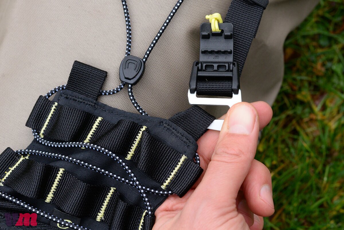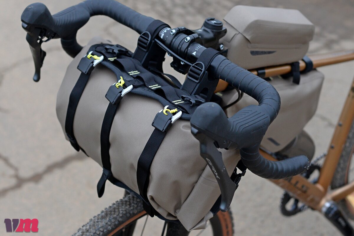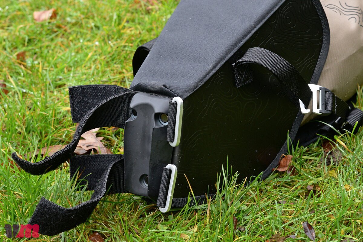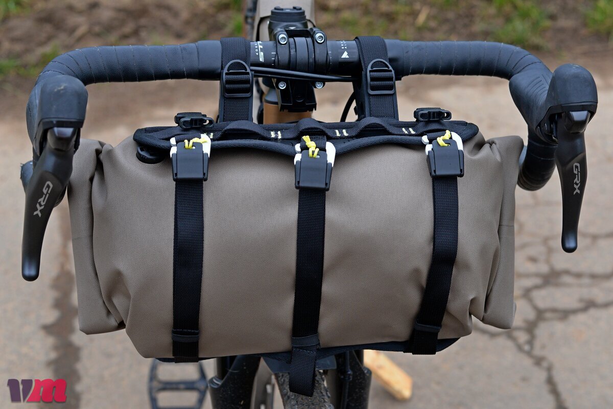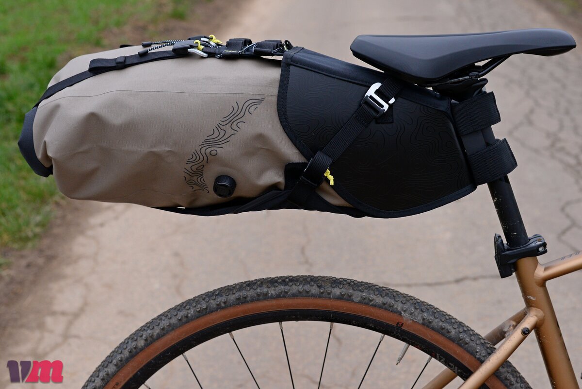 Wie bei der Lenkertasche besteht die Satteltasche aus zwei separaten Komponenten: Halterung und Packsack, beide müssen einzeln erworben werden. Die Halterung ist aus robustem, widerstandsfähigem Material gefertigt und massiv konstruiert, wodurch das Gewicht zwar etwas höher ausfällt, die Stabilität aber deutlich im Vordergrund steht. Besonders ins Auge fällt der Befestigungspunkt an der Sattelstütze: Durch einen Gummiblock geführt, fixieren zwei doppelt ausgelegte Klettbänder in Kombination mit massiven Metallösen die Tasche bombenfest am Sattel. Das ist sicher, aber nicht unbedingt leichtgewichtig. Der Packsack lässt sich ähnlich wie beim Lenkersack gut komprimieren und bietet genug Platz, um ordentlich Material zu verstauen. Praktisch ist das kleine Netz auf der Oberseite, das schnellen Zugriff auf Kleinteile erlaubt. Beim Handling können die Metallhaken wieder zum Nadelöhr werden: Mal lassen sie sich problemlos durch die Ösen ziehen, mal hakt es etwas, was das Be- und Entladen gelegentlich erschwert. Unterm Strich lässt sich die Satteltasche aber sehr fest fixieren, und auf unserer Testfahrt hielt sie problemlos allen Belastungen stand bzw. blieb der Packsack an Ort und Stelle. Insgesamt überzeugt die Kombination aus Robustheit, sicherer Befestigung und praktischem Packsack, auch wenn das Gewicht für manche ein kleiner Nachteil sein könnte.