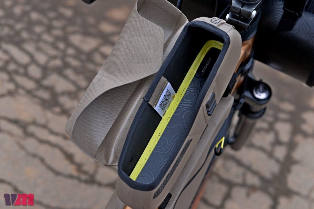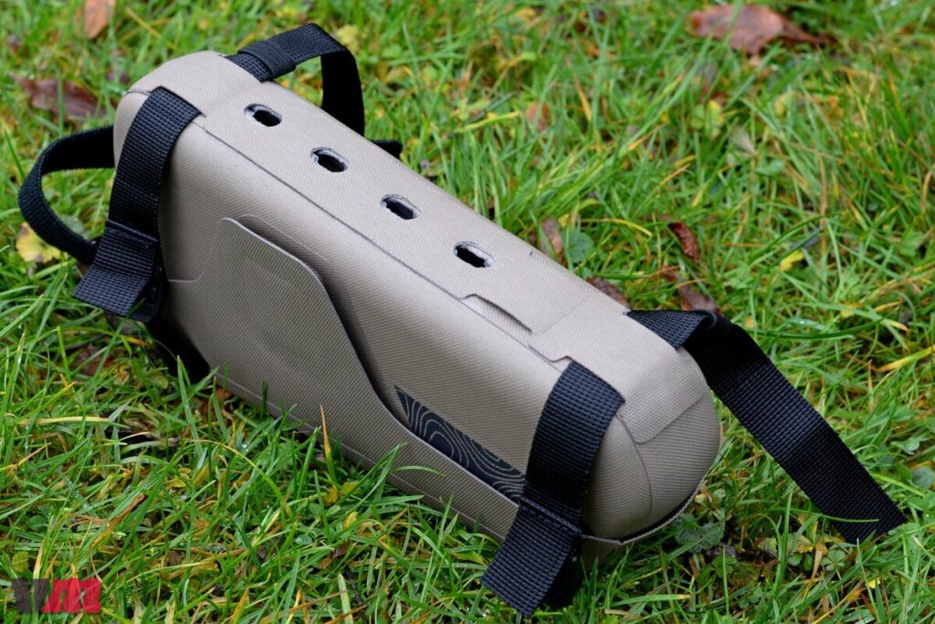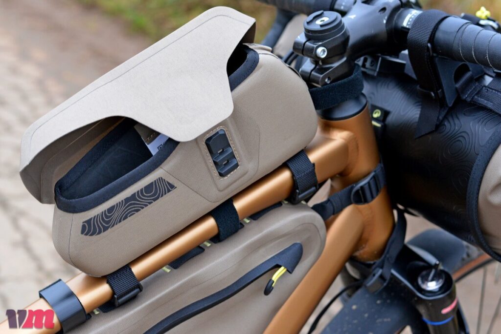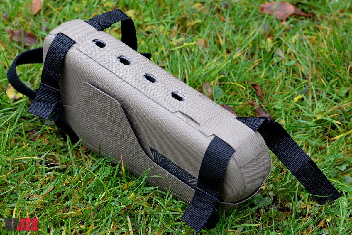 Die Rockrider Oberrohrtasche ADVT 900 ist eine kompakte Bikepacking-Tasche mit etwa 1 Liter Volumen, die speziell für die direkte Positionierung am Oberrohr entwickelt wurde. Die Konstruktion setzt auf verschweißte Nähte, wodurch die Tasche eine hohe Wasserdichtigkeit (IPX3) erreicht und zuverlässig vor Spritzwasser und Regen schützt. Das Material wirkt robust und alltagstauglich, ohne dabei zu schwer zu sein. Die Tasche lässt sich auf mehrere Arten am Rad befestigen: Sie bietet mehrere Befestigungspunkte, an denen sie mit Klettbändern am Rahmen fixiert werden kann, und ist zusätzlich für eine Schraubmontage vorgesehen. Besonders praktisch ist der Fidlock-Magnetverschluss, der im Test sehr gut funktioniert und ein unkompliziertes, schnelles Entnehmen des Inhalts – auch während der Fahrt – ermöglicht. Auf unserer Testfahrt haben wir die Variante mit Klettbändern genutzt; diese Befestigungsmethode ist für flache Wege in Ordnung, zeigt jedoch bei ruppigem Gelände Schwächen, da die Tasche aufgrund ihrer leicht gewölbten Unterseite weniger Auflagefläche hat und dadurch weniger stabil auf dem Oberrohr sitzt. Für anspruchsvollere Strecken empfehlen wir daher klar die Verschraubung, die deutlich mehr Halt bietet.