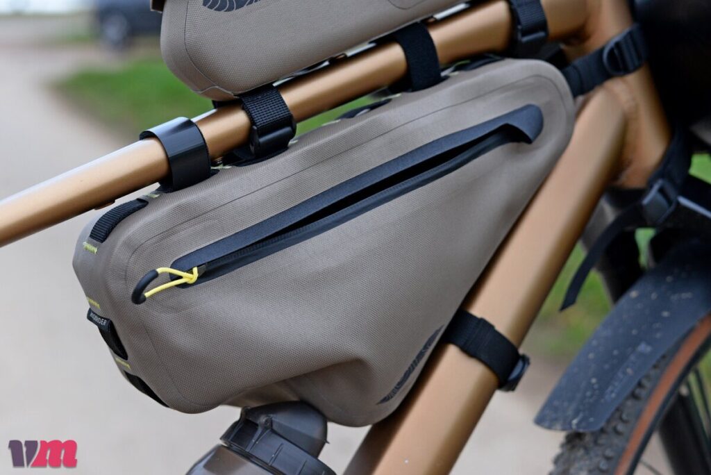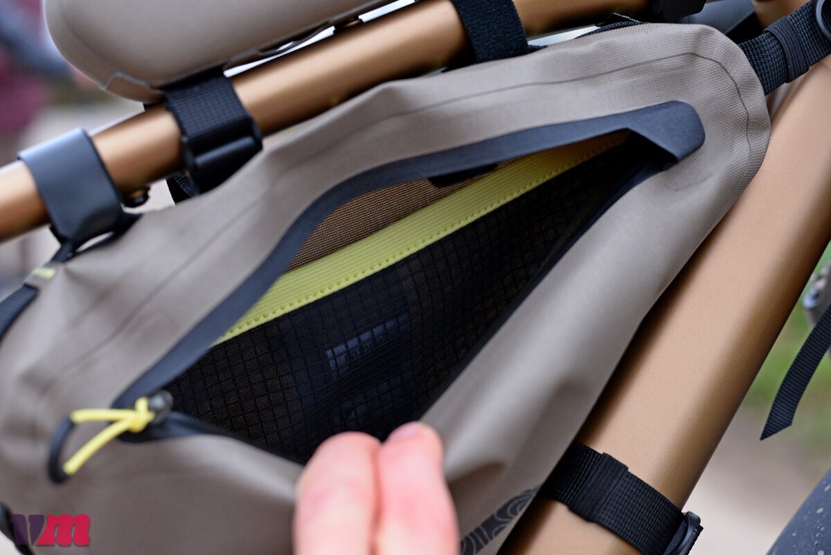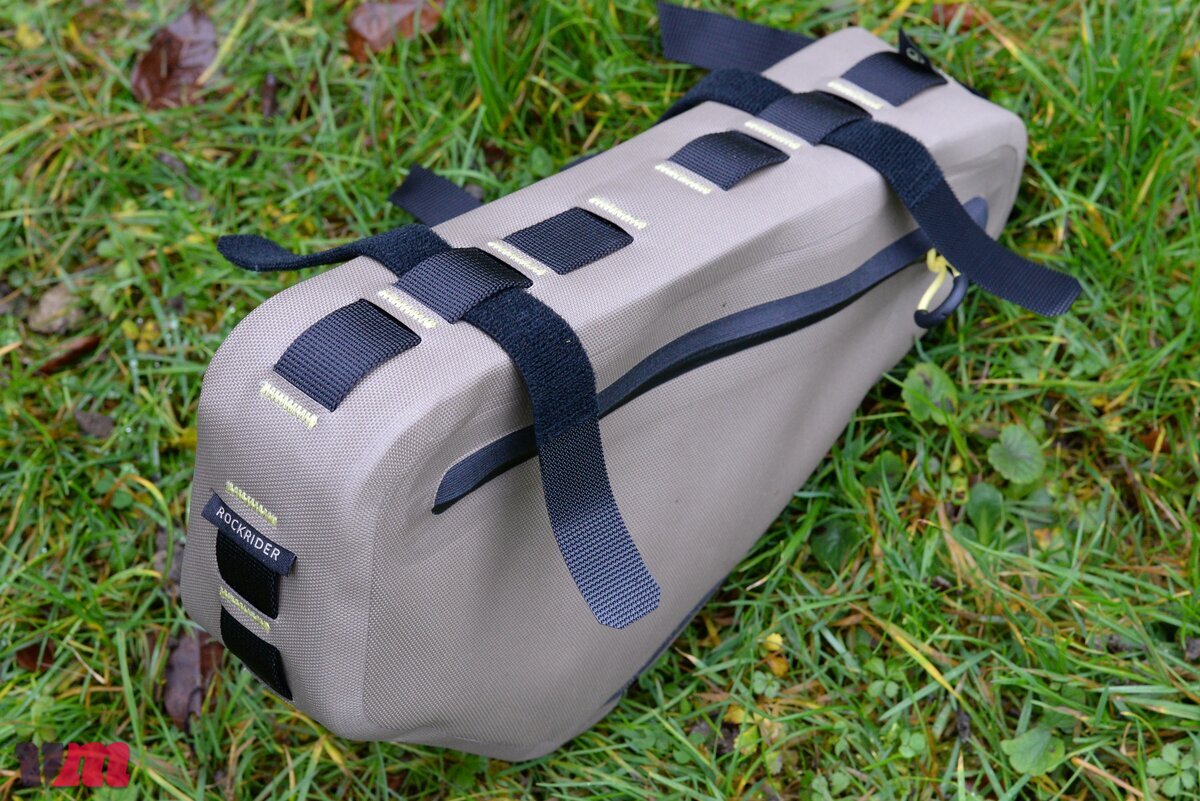 Die wasserdichte Rahmentasche ADVT 900 ist eine praktische Bikepacking-Tasche für den Rahmenbereich. Sie ist aus robustem Polyester gefertigt und verschweißt, sodass Regen und Spritzwasser ihr nichts anhaben können. Die Verarbeitung ist solide und erfüllt ihren Zweck gut, erreicht aber nicht ganz das Niveau der Oberklasse-Modelle. Dafür hat Decathlon bei der Konstruktion viele clevere Details eingebaut: Die Tasche bietet flexible Befestigungspunkte, sodass man sie individuell am Rahmen positionieren kann. Besonders praktisch ist die kleine Innentasche für Schlüssel oder die Pumpenhalterung, die einen schnellen Zugriff ermöglicht. Ein kleiner Wermutstropfen: Die Tasche lässt sich nur zu einer Seite öffnen, eine zusätzliche flache Tasche auf der anderen Seite gibt es nicht. Auf unserer Testfahrt saß die Tasche aber sicher und fest am Rahmen und erwies sich als zuverlässiger Begleiter für längere Touren.