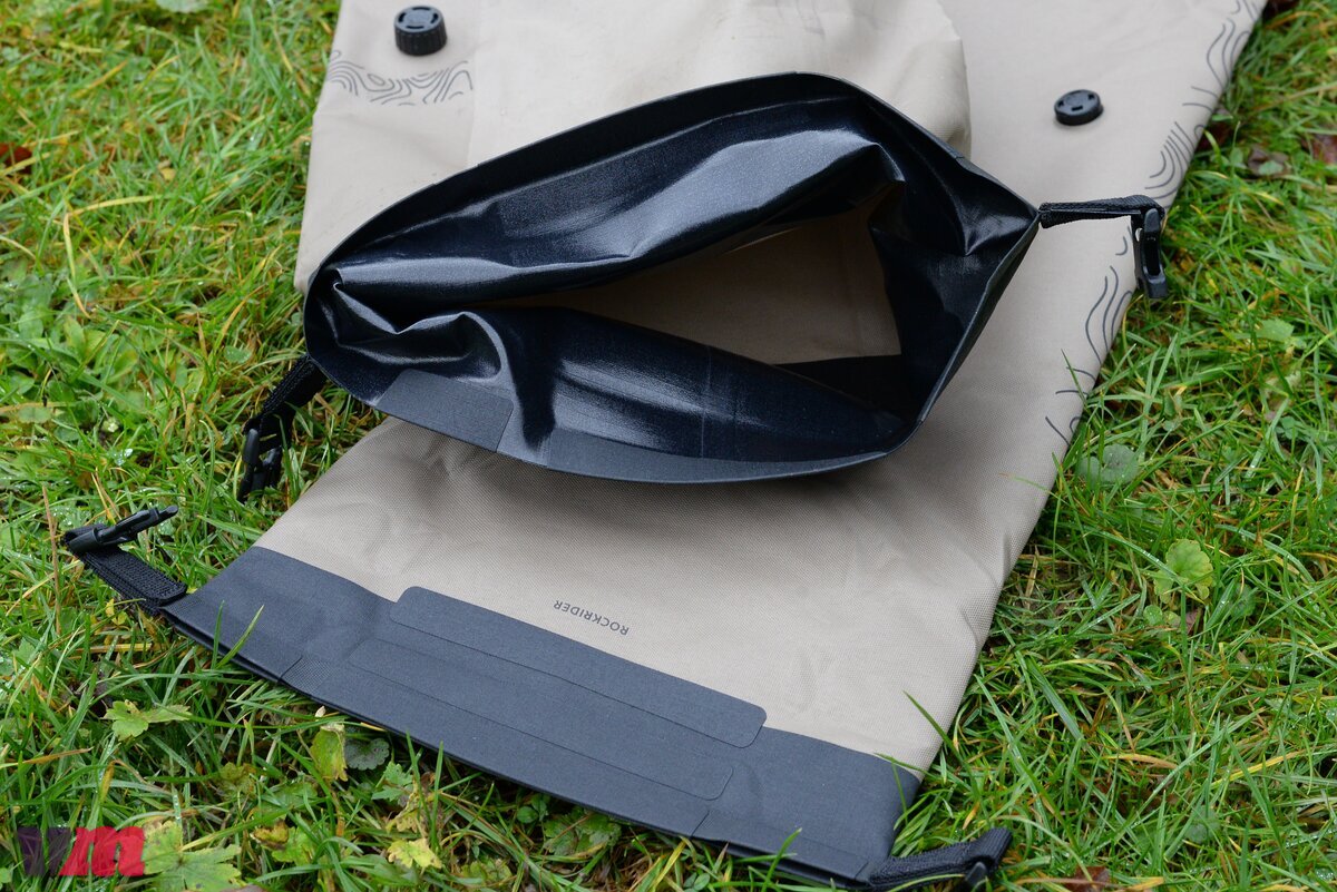 Die Rockrider Lenkertasche ADVT 900 besteht aus zwei separat erhältlichen Komponenten: einer Lenkerhalterung und dem Packsack. Die Halterung ist robust aufgebaut, nutzt widerstandsfähige Materialien und setzt auf stabile Metallhaken sowie Distanzblöcke, die für sicheren Halt am Lenker sorgen – allerdings nicht entfernt werden können. Der wasserdichte Packsack bietet ein variables Volumen von 5 bis 15 Litern, ist sehr großzügig dimensioniert und verfügt über ein praktisches Entlüftungsventil, mit dem sich überschüssige Luft einfach ablassen lässt. Dank IPX6-Zertifizierung bleibt der Inhalt auch bei starkem Regen trocken. In unserem Test machte die Lenkertasche einen sehr massiven und langlebigen Eindruck, was unter anderem an den Metallverschlüssen deutlich wird. Die Montage am Rad ist stabil und zuverlässig, auf der Testfahrt traten keinerlei Probleme auf. Beim Handling fiel jedoch auf, dass sich die Metallhaken in Kombination mit den Riemen nicht immer sauber durch die Ösen ziehen lassen, was das An- und Abnehmen etwas umständlicher macht.