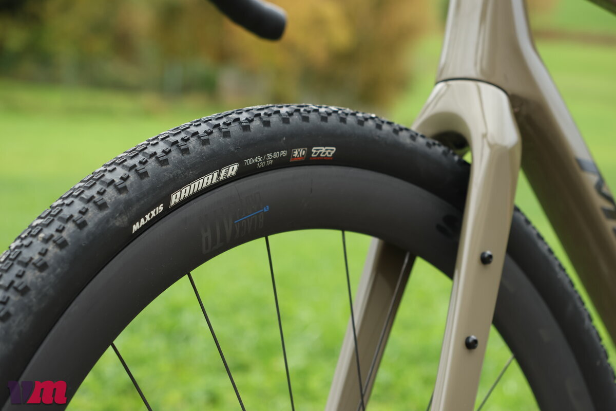 Neben der neuen Shimano GRX Di2 ist der Carbon-Radsatz von Reynolds ein zweites Highlight der Komplettierung. Der Hersteller gibt ein Gewicht von 1.425 Gramm an, was angesichts der aerodynamischen Optimierung sehr wenig ist; fahrfertig und mit Schläuchen aufgebaut wiegt der Satz gut 3,4 Kilo. Die 42 mm tiefen Hookless-Felgen sind bis knapp 34 mm breit, die Innenweite liegt bei 25 mm. Reynolds verspricht sich von der bauchigen Form aerodynamische Vorteile auch mit 45 mm breiten Reifen, wie sie am Silex 9000 montiert sind. Die Maxxis Rambler konnten im Velomotion-Labortest in der 40-mm-Variante bereits mit geringem Rollwiderstand punkten, dazu ist der Reifen schön griffig. Wer will, kann natürlich auf tubeless umrüsten.