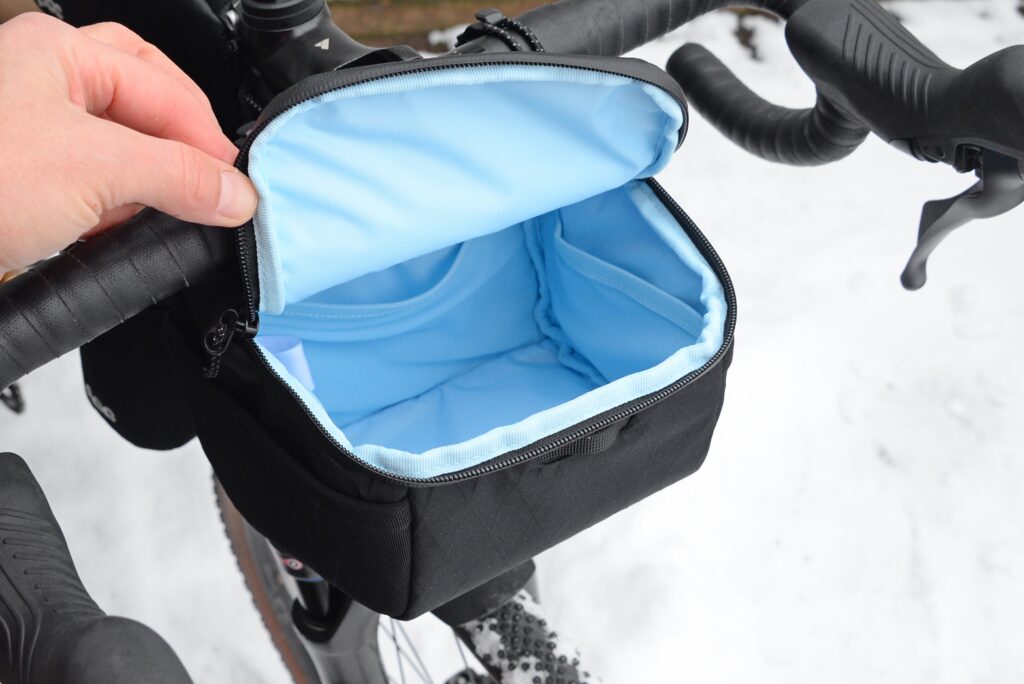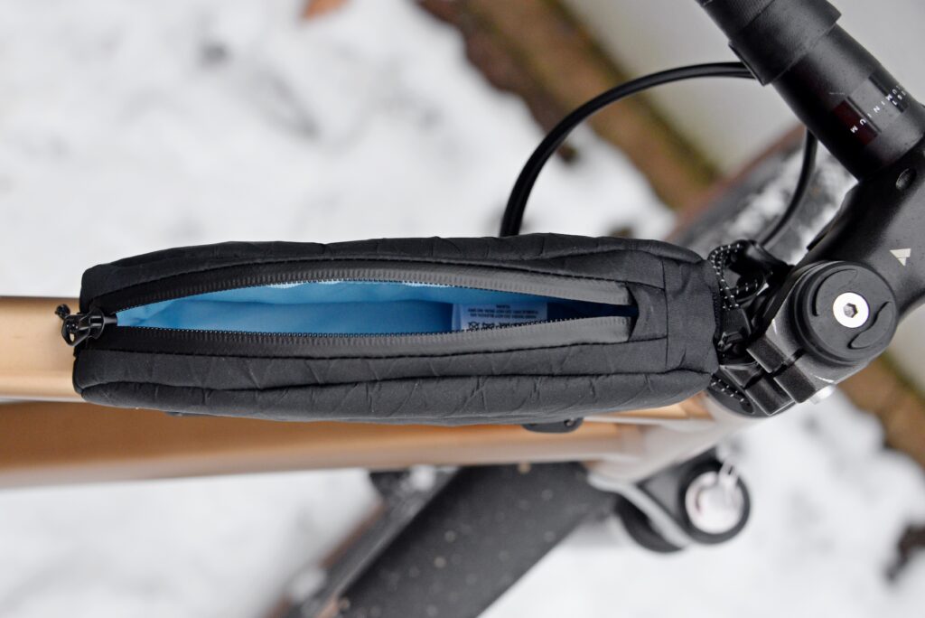 POCs Ultra Bento Bag 0.7L ist eine kompakte Oberrohrtasche, die mit den gleichen robusten, wasserdichten Materialien ausgestattet ist wie die größere Bar Bag und ebenso zuverlässig Schutz bietet. Sie verfügt über praktische Netztaschen  im Inneren, sodass kleine Gegenstände wie Schlüssel oder Riegel sicher verstaut werden können. Zudem gibt es einen Kabeldurchlass, der es ermöglicht, Kabel für Elektronik bequem durch die Tasche zu führen. Die Befestigung der Tasche erfolgt ebenfalls über variable Gummies, die sich an unterschiedliche Rahmengrößen anpassen lassen, allerdings ist es ein bisschen fummelig, die überstehenden Gummies um den Rahmen zu führen. Der Reißverschluss lässt sich dank der Ziehhilfe auch während der Fahrt gut öffnen, obwohl die Ziehhilfe aus einem etwas dickeren Material bestehen könnte, um den Umgang noch komfortabler zu gestalten. Insgesamt sitzt die Tasche bei der Testfahrt jedoch fest und sicher, und auch hier zeigt sich die durchdachte, hochwertige Verarbeitung, die für eine stabile und funktionale Nutzung sorgt.