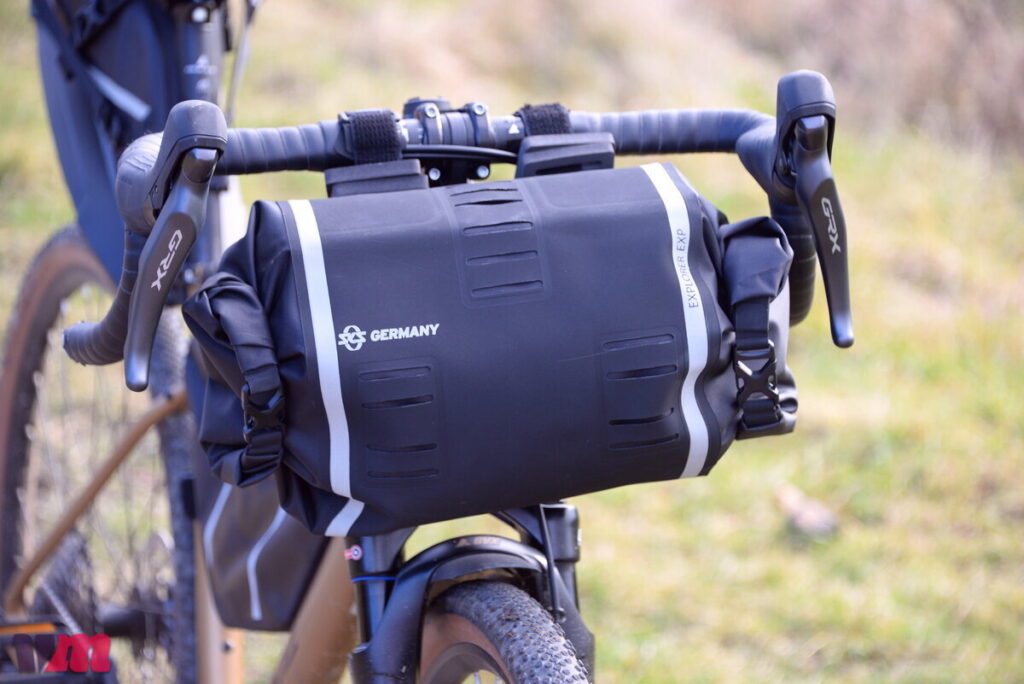 Die SKS EXPLORER EXP BARBAG ist eine robuste Lenkertasche fürs Bikepacking, die aus widerstandsfähigem Polyamid gefertigt ist und auf eine klassische Roll-Top-Konstruktion setzt. Im Test fällt die Tasche besonders durch ihr großes Ladevolumen und die vielen Befestigungsmöglichkeiten an der Front positiv auf, an denen sich zusätzliches Gepäck oder Zubehör fixieren lässt. Der insgesamt sehr stabile und wertige Aufbau macht einen langlebigen Eindruck, während das Handling beim Packen dank integriertem Entlüftungsventil überzeugt, mit dem sich die Tasche gut komprimieren lässt. Befestigt wird sie klassisch per Klett am Lenker, wobei mitgelieferte Abstandshalter eine Montage weiter weg vom Lenker ermöglichen. Die silikonbeschichteten Klettbänder sorgen für sicheren Halt und schützen vor Verrutschen, müssen allerdings vor der ersten Montage passend zugeschnitten werden. In unserem Test präsentiert sich die wasserdichte und mit großen Reflektoren ausgestattete EXPLORER EXP BARBAG als durchdachte, wetterfeste und praxisnahe Lösung, die für alle, die auf Tour vorne am Rad ordentlich Stauraum brauchen eine gute Wahl ist.