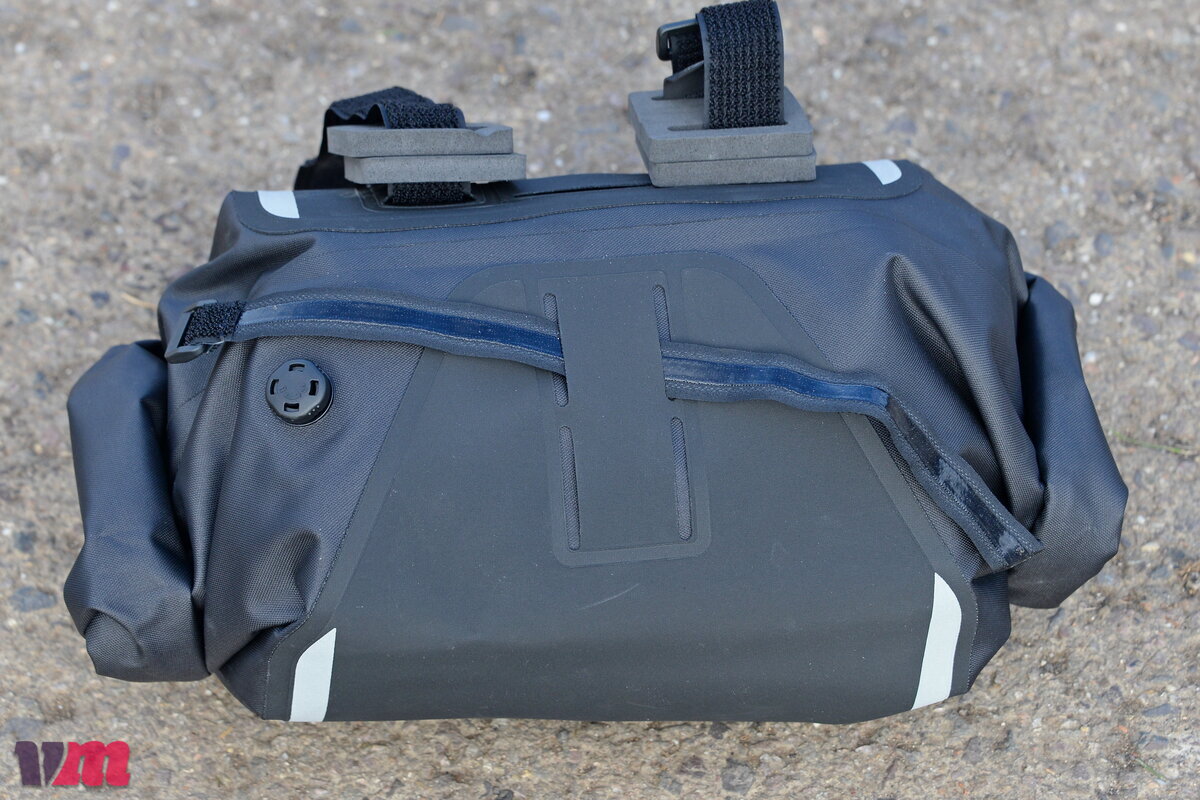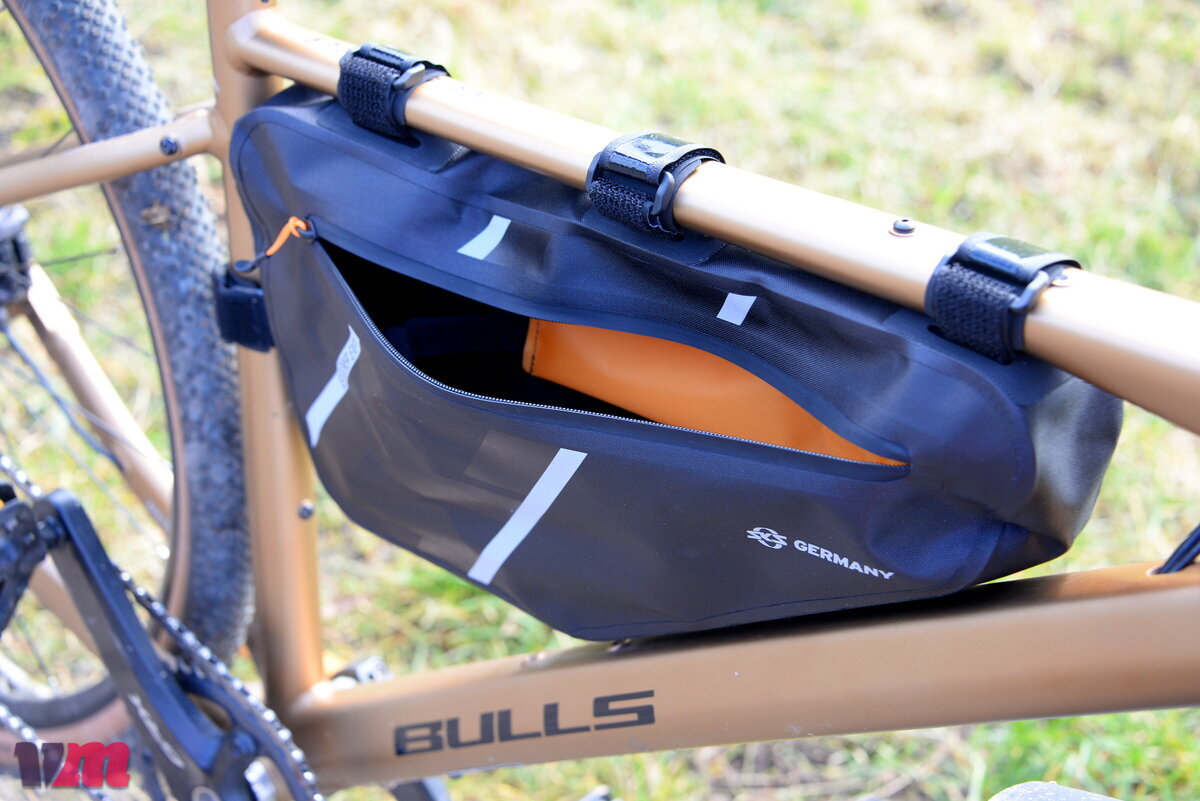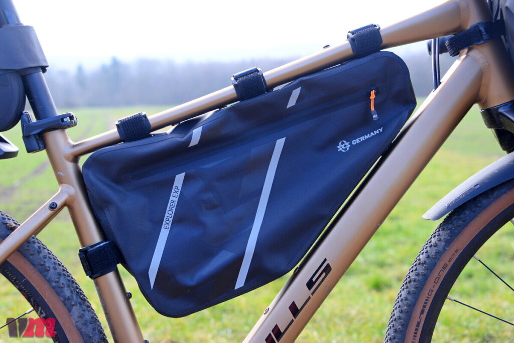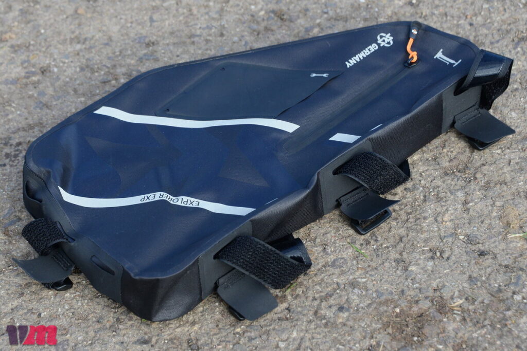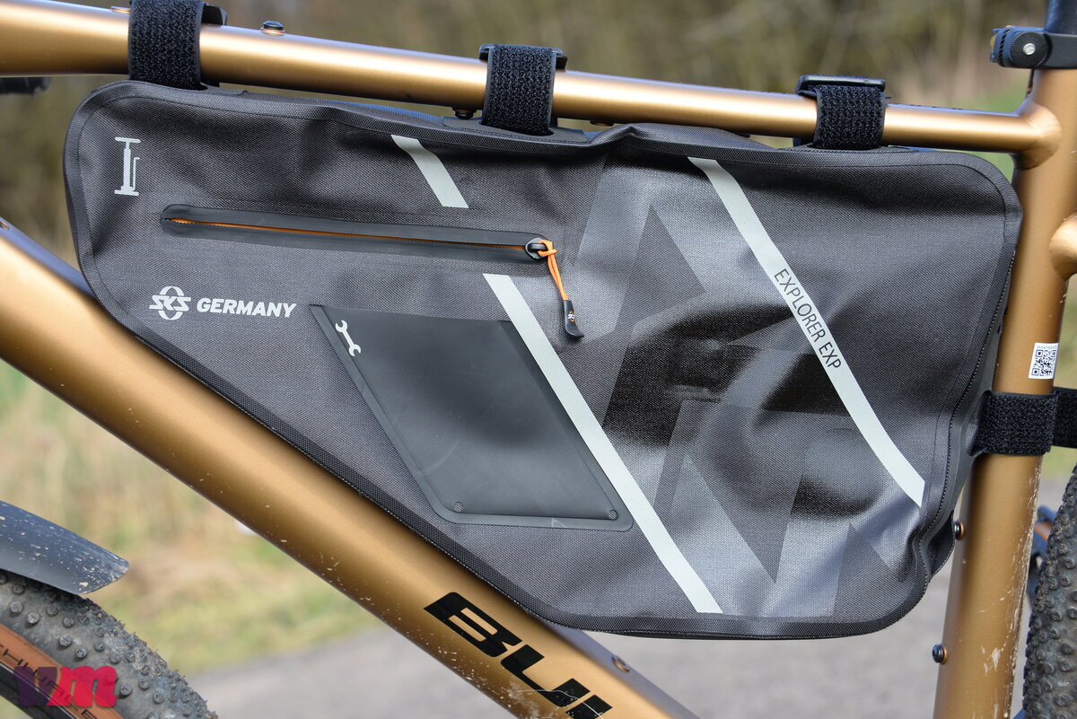 Auch die SKS EXPLORER EXP FRAMEBAG ist eine groß dimensionierte Tasche aus robustem, wasserdichtem Material, die dank ihrer innenliegenden Versteifung im Rahmenaufbau stabil hält, allerdings nicht zu den Seiten hin, wodurch es, je nach Inhalt, zu einem leichten Ausbeulen kommen kann. Die Tasche sitzt bei unserem Test zwar insgesamt gut und sicher im Rahmen, dennoch hätten wir uns einen zusätzlichen Befestigungspunkt am Unterrohr gewünscht, damit sie bei voller Beladung bombenfest sitzt. Schade ist außerdem, dass die Fixierungspunkte am Oberrohr nicht versetzbar sind, was die Anpassung in kombination mit Oberrohrtaschen einschränkt. einschränkt. Durch ihre Größe ist zudem bei unserem Testbike keine Integration einer Trinkflasche im Rahmendreieck mehr möglich, was man bei der Tourenplanung berücksichtigen sollte. Sehr gut gefallen hat uns hingegen, dass SKS die Tasche klar strukturiert aufgebaut hat und Werkzeug sowie Pumpe einen festen, vorgesehenen Platz bekommen – das sorgt für Ordnung und verhindert, dank der Befestigungsmöglichkeiten Klappern während der Fahrt. Ein weiteres Plus sind die großen Reflektoren, die die Sichtbarkeit deutlich erhöhen und ein echtes Sicherheits-Upgrade darstellen. Insgesamt ist die EXP FRAMEBAG eine durchdachte, wetterfeste Rahmentasche mit viel Stauraum, kleinen Schwächen in der Anpassbarkeit, aber klaren Stärken bei Struktur, Robustheit und Sicherheit.