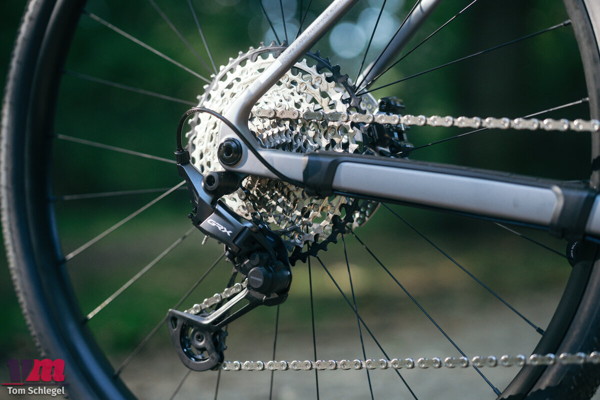 In dieser Hinsicht hat das Cube Nuroad SLX ansonsten nicht viel zu bieten. Der Hersteller verbaut die Shimano GRX-RX820, welche mit geschmeidiger Schaltfunktion und starken Bremsen glänzt. Dazu gibt es einen GRX-610-Kurbelsatz, der minimal schwerer ist als das Topmodell von Shimano. Die 10-51er Zwölffach-Kassette ist einsteigerfreundlich breit abgestimmt, sodass die Komplettgruppe wirklich keine Wünsche offen lässt. Klar, eine elektronische Schaltung bietet noch einmal bessere Funktion, doch dann wäre das Cube deutlich teurer. Nachrüsten lässt sich so etwas in jedem Fall – und dank UDH-Hinterradaufnahme kann man sogar die neuen Full-mount-Schaltwerke von SRAM an den Alu-Rahmen montieren.