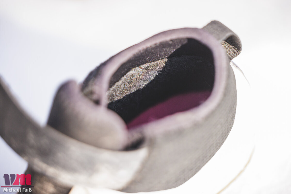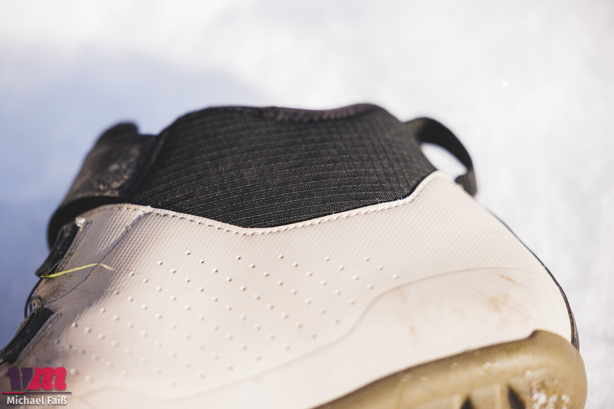 Ein kritischer Punkt in der Anfangsphase war der Schaft. Der Schuh ist mittelhoch geschnitten und der Abschluss saß bei unserem Tester exakt auf Höhe des Knöchels. Dies führte bei der ersten Ausfahrt zu unangenehmen Reibungen und Druckstellen. Der Schaftabschluss ist zwar flexibel, aber dennoch stabil genug, um bei jeder Tretbewegung spürbar zu sein. Die gute Nachricht: Dieses Problem löste sich buchstäblich in Luft auf. Nach etwa eineinhalb Ausfahrten hatte sich das Material offenbar so weit angepasst oder weich gearbeitet, dass das Drücken verschwand. Mittlerweile umschließt der Schaft den Knöchel angenehm und unauffällig. Es empfiehlt sich also, dem Schuh eine kurze Einlauf- beziehungsweise „Einfahrzeit“ zu gönnen, bevor man auf die ganz große Tour geht.