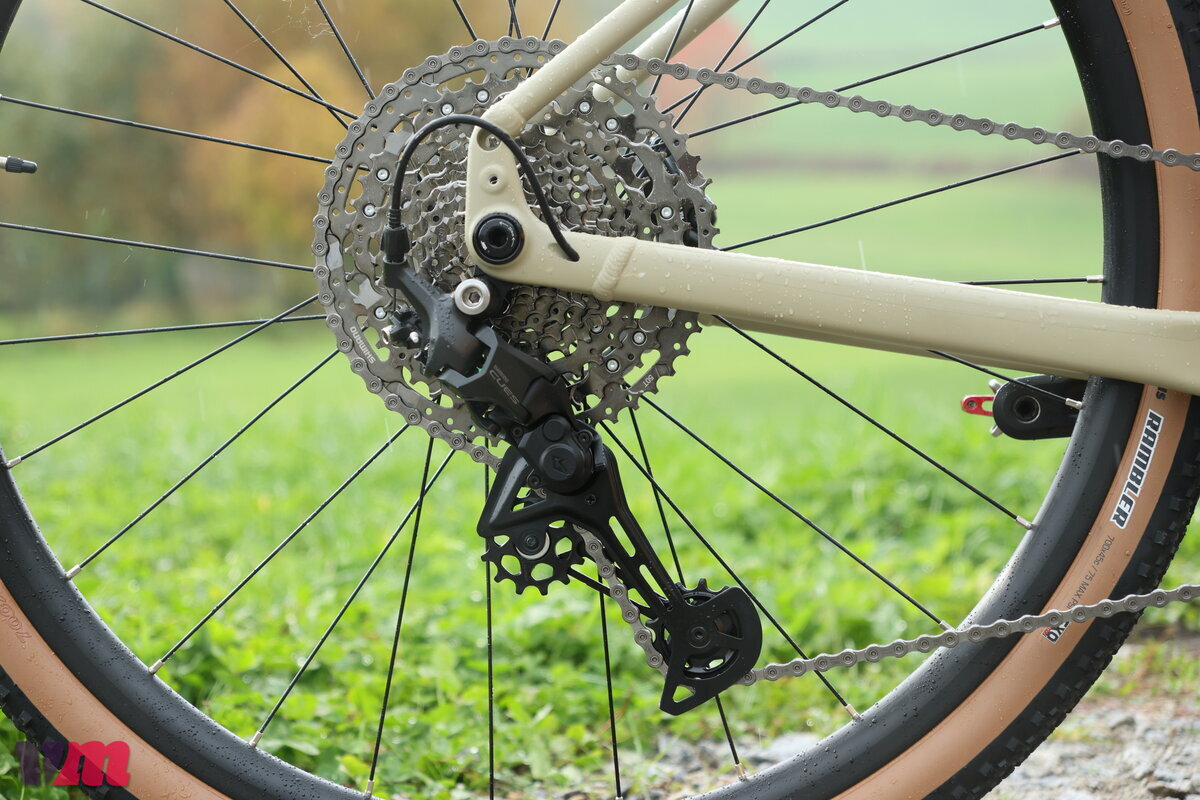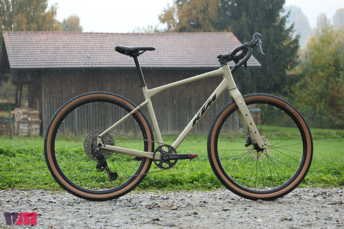 Dann fühlt sich das KTM auf einmal ziemlich flott an: Die Sitzhaltung wechselt von ausgewogen nach sportlich, und mit der neutralen Lenkung lässt sich das Rad auf jedem Terrain sicher bewegen. Mit den recht griffigen Maxxis Rambler in 45 mm Breite (auch 50-mm-Reifen passen rein) und der 11-50er Kassette ist das Bike eher auf Trail-Abenteuer ausgelegt, zu denen auch die kompakte Sitzhaltung gut passt. Im Vergleich zur Zwölffach-Kassette teurerer GRX-Bikes fehlt nur ein Schnellgang, den man jedoch nicht wirklich vermisst. Da die Elffach-Kassette auf einem normalen HG-Freilauf montiert ist, lassen sich übrigens auch andere Zahnkränze verwenden – zum Beispiel deutlich enger abgestufte Rennrad-Kassetten wie 11-32, wenn man auf flachem Terrain unterwegs ist.