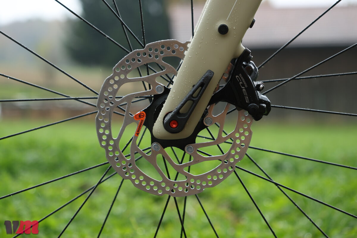 Unterhalb des Gravelator 25 gibt es nun sogar ein Gravelbike für 899 Euro, das Gravelator 30. Dieses ist mit neun Gängen, mechanischen Bremsen und Schnellspannern deutlich einfacher gehalten, doch sogar hier werden Schaltzug wie Bremsleitungen bereits von oben ins groß dimensionierte Steuerrohr geführt. Zwar sind die Leitungen so vorm Lenker deutlich sichtbar, doch so ist es ganz einfach, den kurzen Vorbau gegen einen längeren zu tauschen, will man gestreckter sitzen.