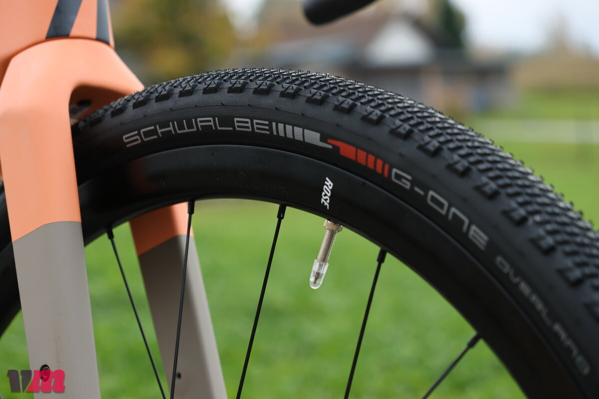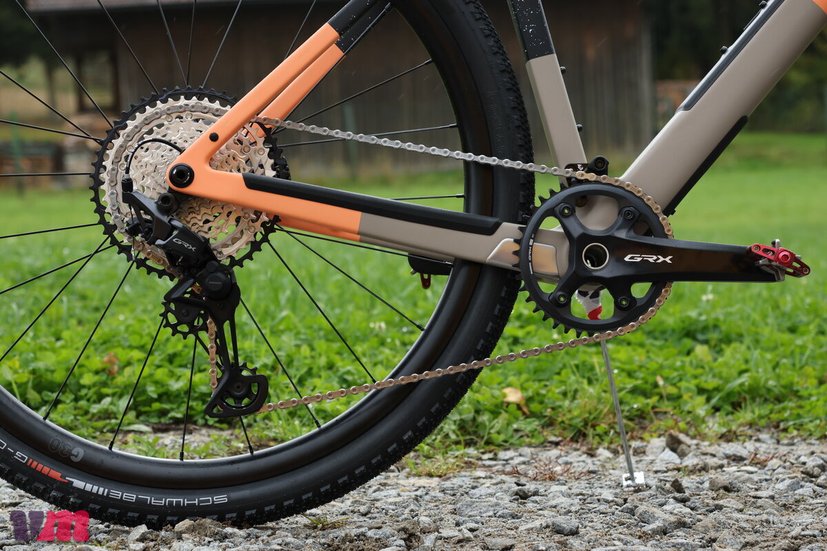 Typisch fürs Backroad ist die spezielle Befestigung der Carbonsattelstütze, die diese über einen größeren Bereich flexen lässt; schön sind die vertieft eingelassenen Gewinde in der Gabel. Rose stattet das Backroad Unsupported mit mechanischer Shimano GRX in der Top-Version aus; mit der MTB-mäßigen 10-51er Kassette lassen sich steilste Anstiege bewältigen. Ein besonderes Merkmal dieser Modellvariante sind die 50 mm breiten „Schwalbe G-One Overland“-Reifen; alle anderen Backroads sind mit 45er Pneus ausgestattet.