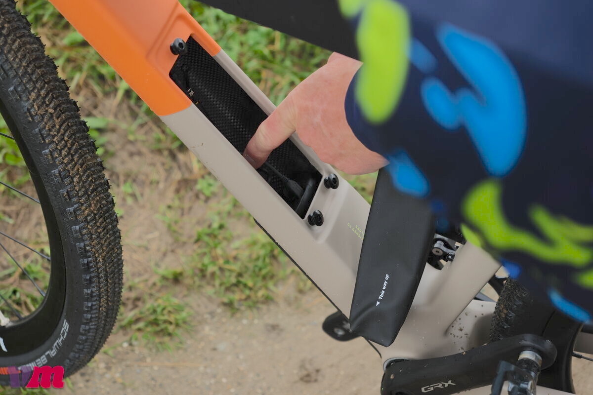 Diese besteht aus einem extrem hochwertigen, kompakten SON-Dynamo, einer kleinen Rückleuchte am Hinterbau und einem hellem Supernova-Strahler, der per Daumentaste von Abblend- auf Fernlicht umgeschaltet werden kann. Außerdem gibt es einen Schalter mit drei Stellungen im rechten Lenkerende: Licht an – Licht aus – Ladebetrieb. Ganz klar: Mit einer derart hochwertigen Lichtanlage wendet sich Rose an Menschen, die viel autark und im Dunklen unterwegs sind und auch den dafür notwendigen Aufpreis zu zahlen bereit sind. Dieser liegt im Vergleich zum Schwestermodell Rose Backroad GRX 820 ohne Elektrik bei 1.400 Euro. Als kleines Extra gibt’s beim Backroad Unsupported die „Top Tube Bag“, während die Framebag auch bei den anderen Modellen mitgeliefert wird.