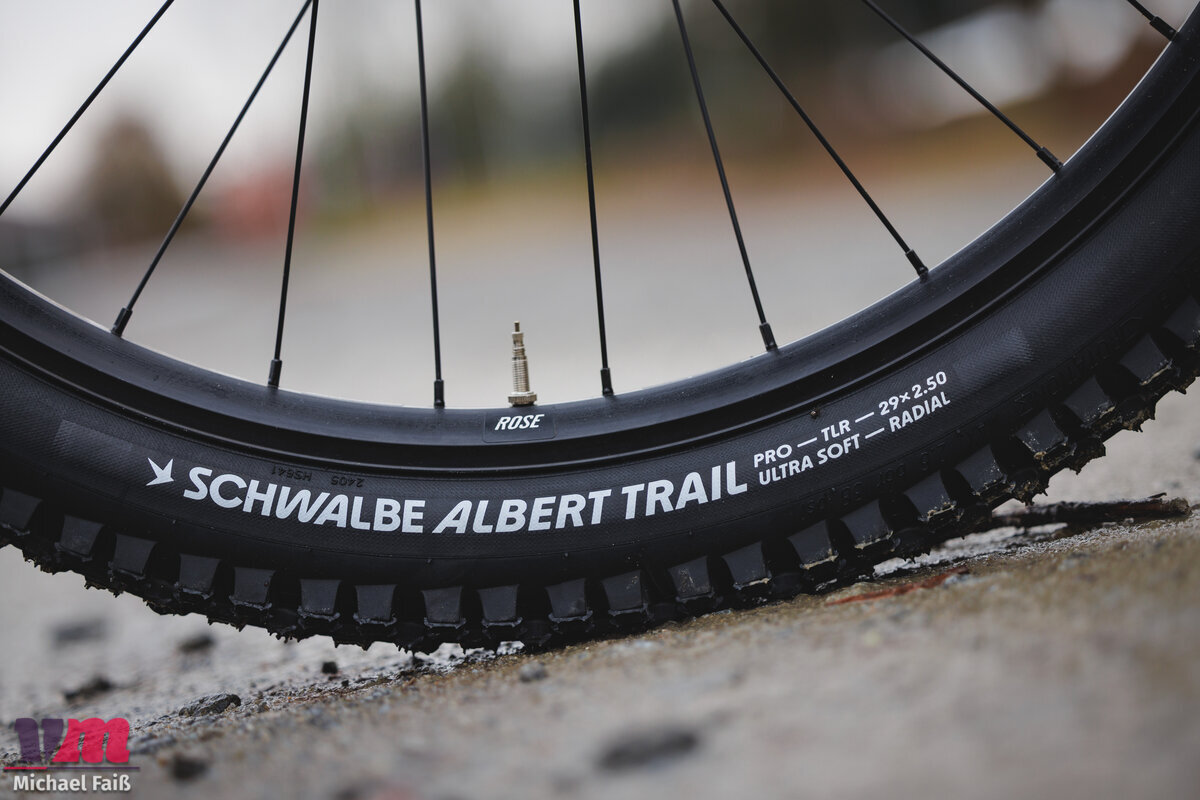 - Laufräder & Reifen: Hier wird nicht gespart. Die Rose-eigenen Alu-Laufräder wirken robust, darauf montiert sind die neuen Schwalbe Albert Reifen in der Radial-Karkasse (vorne Trail Ultra Soft, hinten Gravity Soft). Eine absolute Top-Wahl für Grip und Dämpfung.