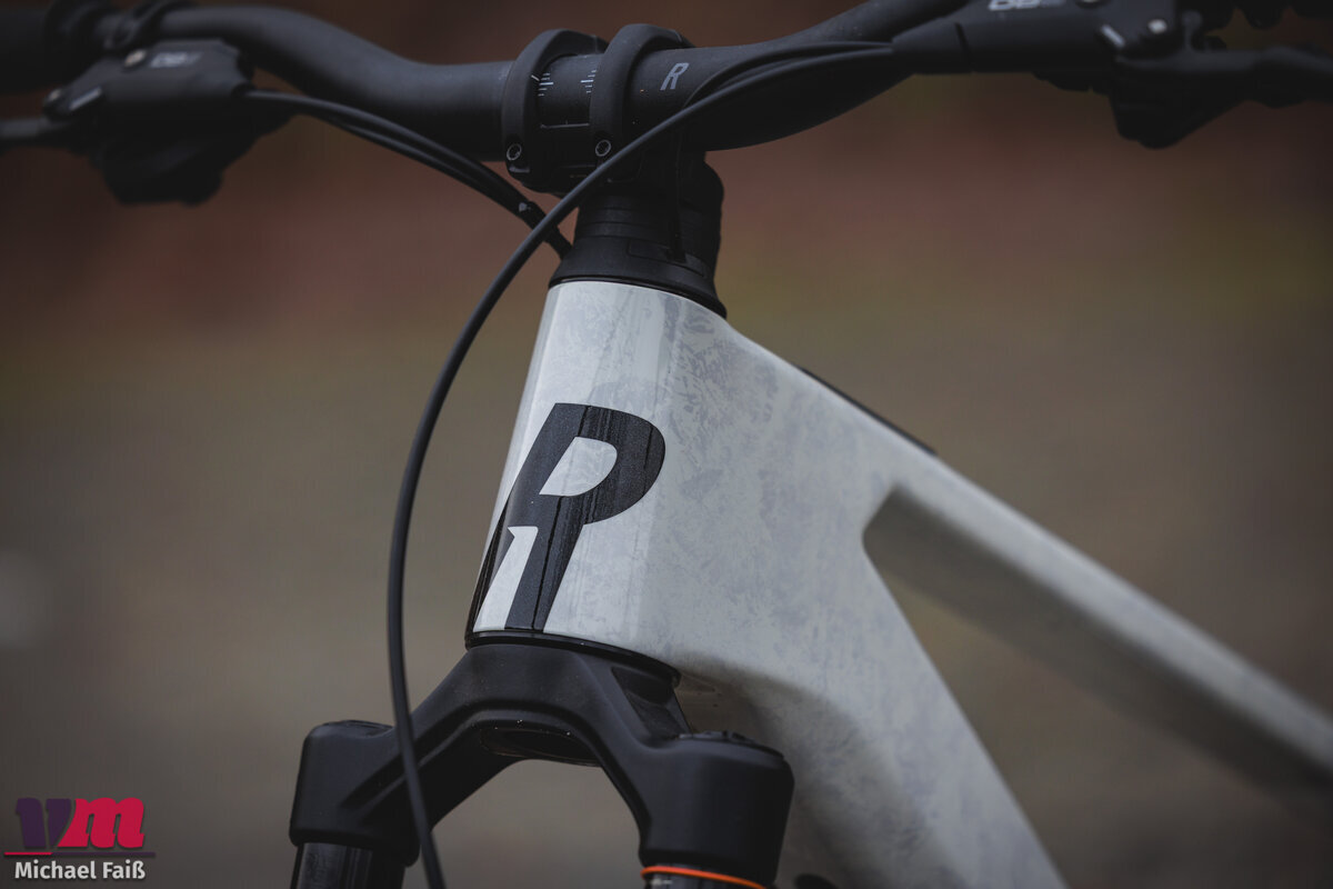 Optisch geht Rose mit dem Slab Plus neue Wege. Das Design ist kantig, flächig und bricht bewusst mit den organischen Formen vieler Mitbewerber. Besonders auffällig ist die Lackierung unseres Testbikes in „Off Snow White Shiny“ mit einer Marmor-Optik, die sicherlich polarisiert, aber dem Rad einen unverwechselbaren Charakter verleiht. Alternativ steht das gesetztere „Liquid Racing Green“ zur Wahl.