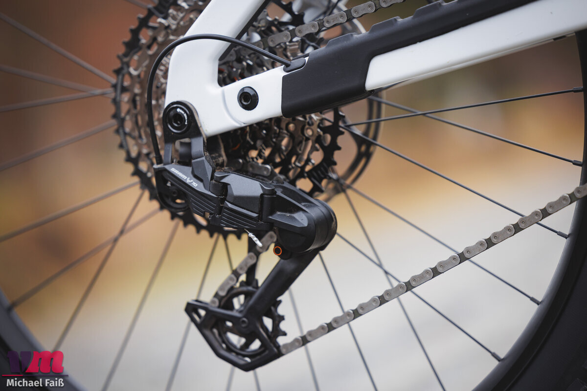 - Schaltung: Verbaut ist mit der SRAM Eagle 70 die günstigste Gruppe der Transmission-Reihe. Bewährt gute und zuverlässige Schaltperformance auch unter Last trifft auf eine mechanische Ansteuerung und eher günstige Haptik und Optik.