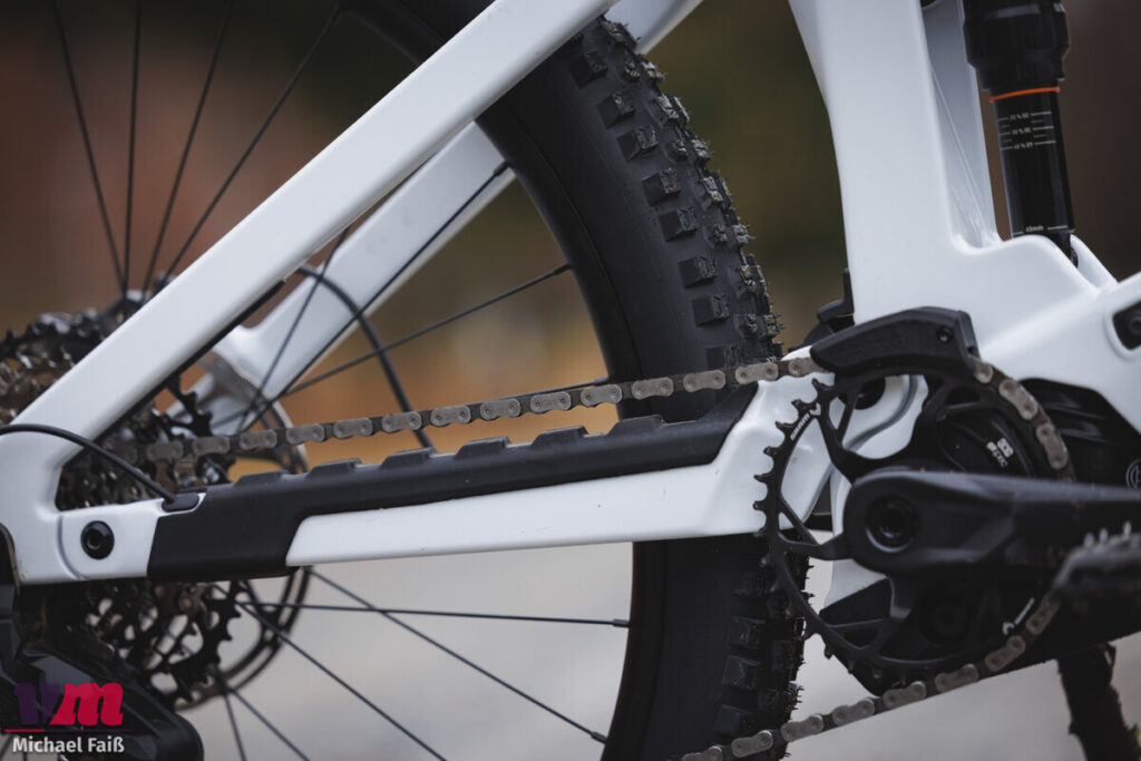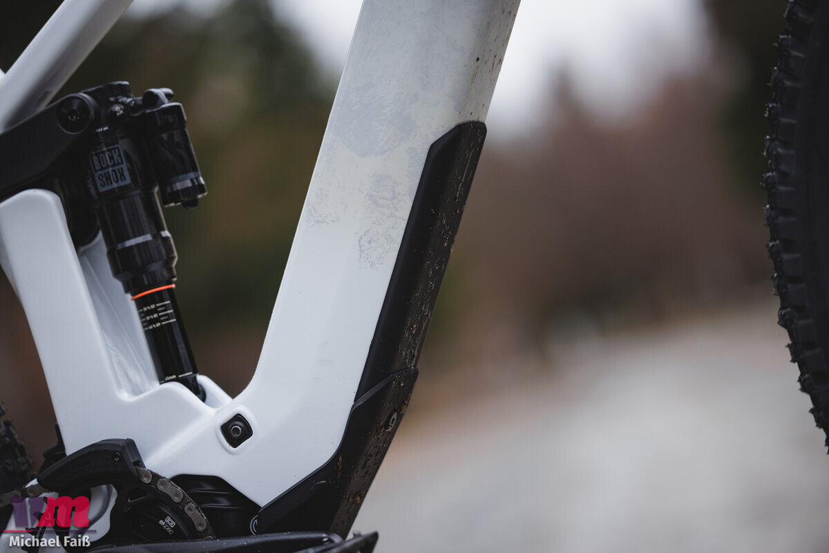 Der Rahmen besteht komplett aus Carbon – sowohl der Hauptrahmen als auch der Hinterbau. Das ist in dieser Preisklasse (Start ab 4.900 Euro) keine Selbstverständlichkeit. Bei genauerer Betrachtung fallen funktionale Details auf, die zeigen, dass die Entwickler den Einsatzzweck ernst genommen haben. Der Kettenstrebenschutz ist großzügig bemessen und zieht sich weit nach vorne, ebenso ist die Sitzstrebe innen gummiert. Am Unterrohr findet sich ein solider Schlagschutz, der weit nach oben reicht, und auch der Motor ist durch einen zähen Kunststoffpanzer vor Aufsetzern geschützt.