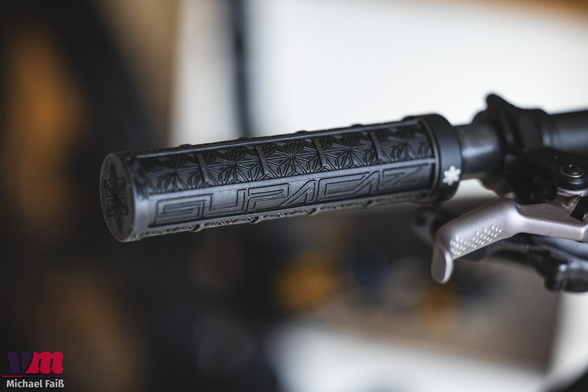 Die Konstruktion setzt auf ein „Dual-Density High Performance Rubber“. Was fancy klingt, bedeutet in der Praxis: Ein härterer Innenkern soll das Verrutschen auf dem Lenker verhindern, während die äußere Gummimischung für den nötigen Grip sorgt. Das Profil selbst besteht aus einer Mischung des Supacaz-Logos und klassischen Querlamellen, die für zusätzlichen Halt sorgen sollen. Auffällig ist, dass die Griffenden mit Gummi überzogen sind – eine Konstruktion, die zwar clean aussieht, aber im rauen Einsatz ihre Tücken haben kann. Stürze oder unachtsames ablegen des Bikes kann hier schon zu Beschädigungen am Griff sorgen.