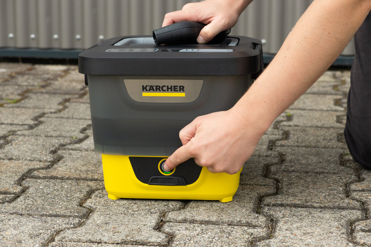 Im Unterschied zu Geräten, die ihr Wasser über einen externen Kanister ansaugen oder auf einen Schlauchanschluss angewiesen sind, setzt der Kärcher OC 4 im Bike-Kit auf ein integriertes Wassersystem. Das bedeutet: Kein zusätzlicher Kanister, keine externe Wasserzufuhr, keine weiteren Anschlüsse – im Idealfall reicht es, den Tank zu befüllen, den Akku einzusetzen und loszulegen.