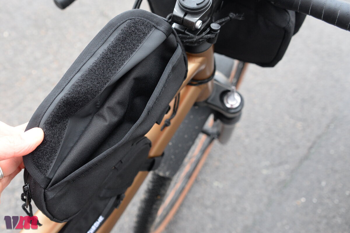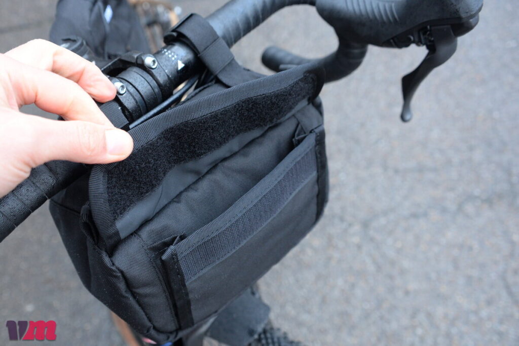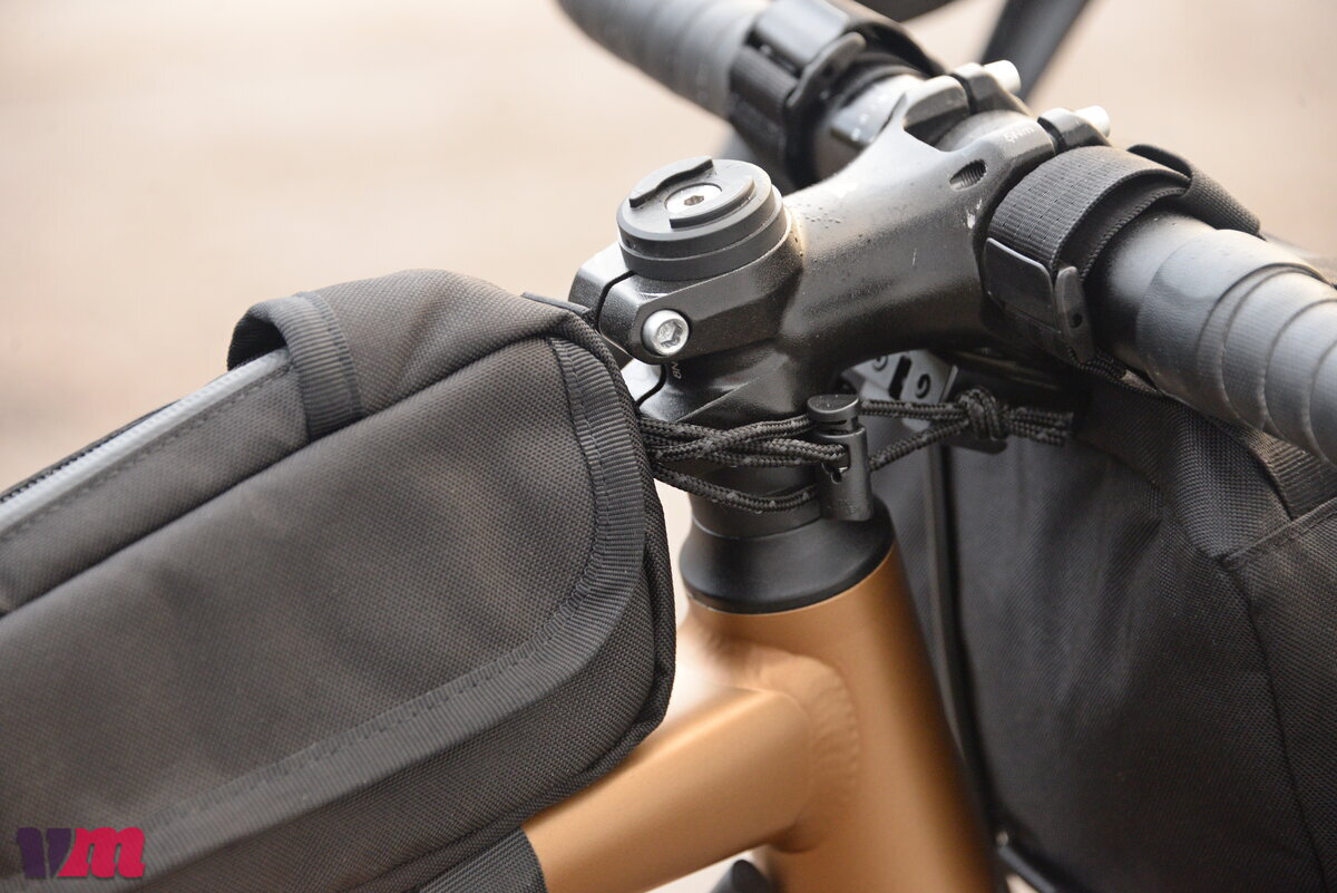 Gefertigt aus dem gleichen robusten, wasserdichten Material wie die Lenkertasche, bietet die Holman Top Tube Bag zuverlässigen Schutz gegen Regen. Die Konstruktion der Tasche umfasst drei separate Fächer, von denen jedes auf seine Weise vor Nässe geschützt ist: Das linke Seitenfach verfügt über einen überlappenden Schutz, das mittlere Fach ist mit einem wasserdichten Reißverschluss ausgestattet und das rechte Fach schließt mit einem überlappenden Klettverschluss. So hat jedes Fach eine unterschiedliche Zugriffsmöglichkeit, während die beiden Reißverschlussfächer zusätzlich einen überlappenden Schirm besitzen, unter dem der Zipper im geschlossenen Zustand verschwindet – ein sauberer und stylischer Look. Die Dreifachfach-Konstruktion verleiht der Tasche zudem eine hohe Eigenstabilität. Befestigt wird sie mit zwei großzügigen, weichen Klettverschlüssen am Oberrohr, die bei Bedarf zugeschnitten und versetzt werden können. Am Lenker ist lediglich eine Kordel vorgesehen, die zwar optisch nett wirkt, aber nur mäßig Halt bietet; auf holprigen Strecken neigt die Tasche daher zum seitlichen Verrutschen, hier empfiehlt sich der Austausch gegen ein Klettband. Auf befestigten Straßen bleibt sie jedoch zuverlässig an Ort und Stelle.