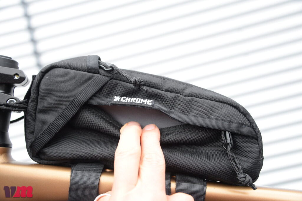 Die Holman Handlebar Bag von Chrome Industries ist eine coole, kompakte Lenkertasche mit ca. 3 Litern Volumen, ideal für all die kleinen Dinge, die unterwegs griffbereit sein sollen – Smartphone, Schlüssel, Geldbörse oder auch ein kleines Buch für den Park. Sie besteht aus robustem 600D recyceltem Polyester mit 150D-Liner und ist durch einen wasserdichten Reißverschluss am Hauptfach und wetterbeständige Materialien gut gegen Feuchtigkeit geschützt, auch wenn sie nicht voll „wasserdicht“ im ISO-Sinne ist. Innen gibt’s eine praktische Netztasche für Ordnung, außen ein großes Fach mit sicherem Klettverschluss, der nicht einfach aufgeht. Statt klassischer Klettbänder setzt Chrome auf einen stabilen Gurt mit Klemmsystem, ähnlich einem Fahrzeuggurt, das sorgt für einfache Montage und feste Verbindung am Lenker. Die Fixierungspunkte lassen sich variabel verschieben, was echt praktisch ist, und eine Rahmenbefestigung ist eher optional als Pflicht. Durch die Schaumstoff-Verstärkung im Inneren bleibt die Tasche stabil, ohne steif zu sein. Cool: Dank der Ösen und einfachen Montage kann sie im Handumdrehen auch als Umhängetasche genutzt werden. Schade nur, dass Chrome kein passendes Umhängeband mitliefert.