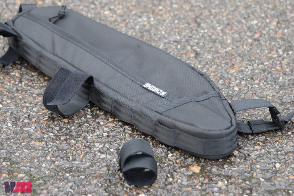 Die Holman Frame Bag fügt sich nahtlos ins Design der Lenker- und Oberrohrtasche ein und ist in zwei Größen erhältlich, die sich nur in den Abmessungen unterscheiden: S/M: 41,9 × 8,9 × 5 cm, L/XL: 50,8 × 11,4 × 5 cm, wobei die L/XL-Version in unserem Testbike (Rahmengröße M) nicht passte. Die Tasche verfügt über zwei Reißverschlussfächer: Das linke ist unterteilt und ideal für flache Gegenstände wie Smartphone, Riegel oder Schlüssel, das rechte enthält eine unterteilte Netztasche, deren Zugriff durch den überlappenden Regenschutz während der Fahrt etwas unhandlich ist. Positiv hervorzuheben sind die flexiblen Fixierungspunkte: Die beiden unteren Bänder mit Schnallen erlauben eine straffe, stabile Montage im Rahmen, sodass die Tasche sicheren Halt behält.