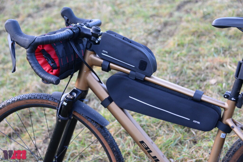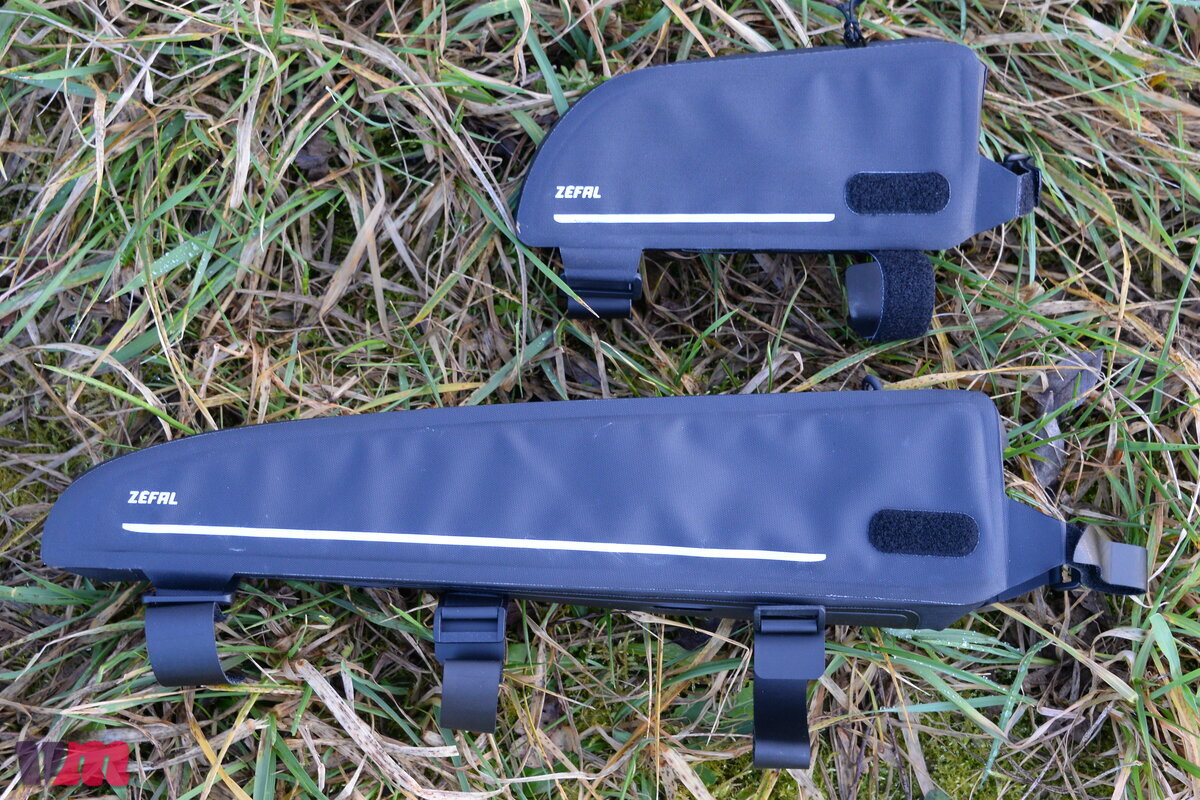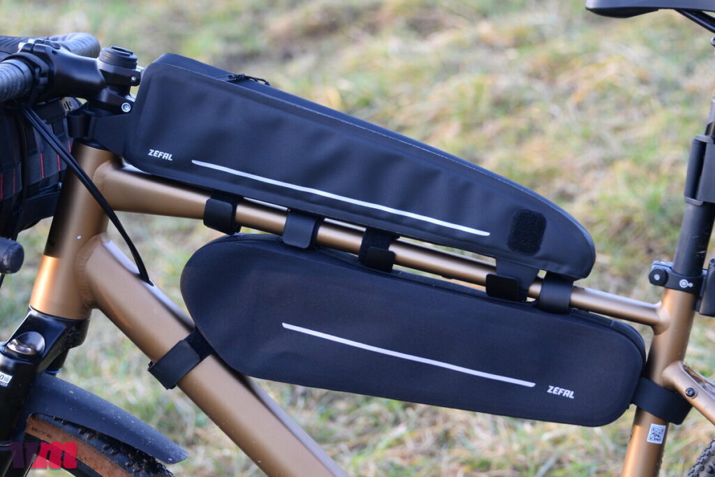 Zéfal ergänzt sein Bikepacking-Sortiment mit den Oberrohrtaschen Z ADVENTURE T1 und Z ADVENTURE T3, die im grundlegenden Aufbau identisch sind und klar auf Funktionalität ausgelegt wurden. Beide Taschen bestehen aus robusten, widerstandsfähigen Materialien, sind wasserdicht und an den Seiten versteift, wodurch sie auch bei voller Beladung ihre Form behalten. Im Inneren zeigen sich die Unterschiede: Die T1 verfügt über eine offene Netztasche, einen integrierten Schlüsselhalter sowie einen Kabelausgang, etwa für das Laden von Geräten unterwegs. Die T3 bietet ebenfalls eine kleine Netztasche, zusätzlich einen variabel versetzbaren Trenner, verzichtet im Vergleich zur T1 jedoch auf Schlüsselhalter und Kabelausgang. Im Test überzeugte bei beiden Modellen die variable Befestigung, da sich alle Befestigungspunkte – mit Ausnahme des hinteren – flexibel versetzen lassen und sich so gut an unterschiedliche Rahmen anpassen. Weniger gefallen haben uns die verwendeten Klettbänder, die recht steif ausfallen und sich vergleichsweise schwer sauber am Rad positionieren lassen; hier wären anschmiegsamere Lösungen wünschenswert gewesen. Dennoch saßen die Taschen auf der Testfahrt fest und sicher am Rad. Wer auf Klett verzichten möchte, erhält die T1 auch als Schraublösung, was besonders für eine dauerhafte Montage interessant ist.