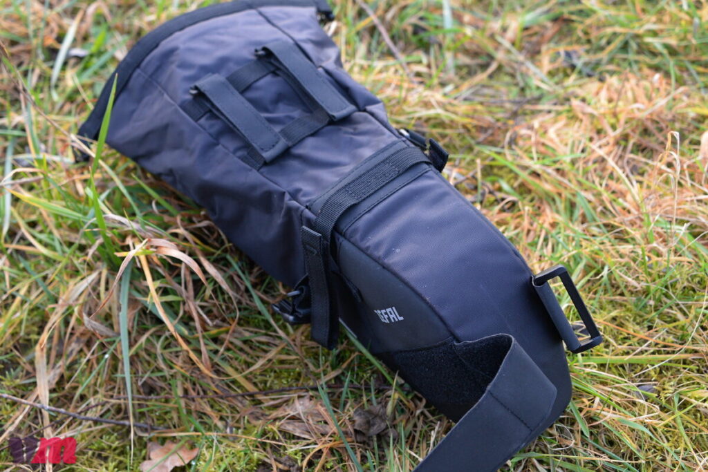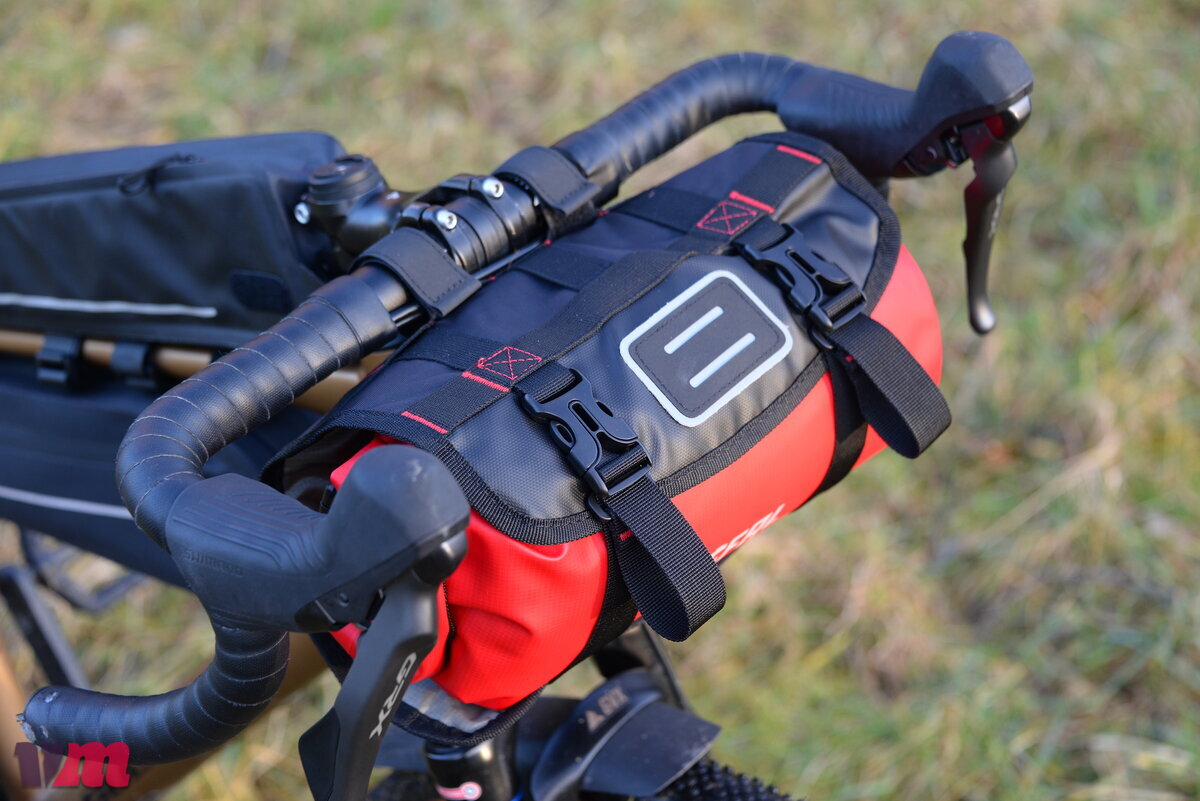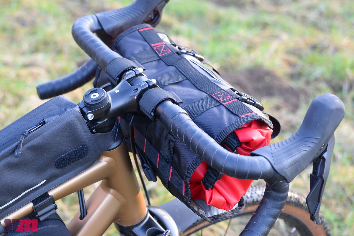 Mit der Z ADVENTURE F5 setzt Zéfal auf eine bewusst einfache, aber sehr durchdachte Lenkertasche für den Bikepacking-Einsatz. Konstruktiv besteht sie aus einer flexiblen Aufnahme und einem separaten, wasserdichten Packsack, der den Inhalt zuverlässig vor Regen und Schmutz schützt. Verarbeitet werden robuste, abriebfeste Materialien, die auf Langlebigkeit und Praxistauglichkeit ausgelegt sind. Neben der getesteten Größe ist die Tasche auch in einer 10-Liter-Variante erhältlich. Im Test konnte die Z ADVENTURE F5 vor allem mit ihrer Einfachheit und hohen Flexibilität überzeugen: Die Aufnahme lässt sich schnell und unkompliziert am Lenker montieren, während die variabel positionierbaren Klettbänder eine gute Anpassung an unterschiedliche Cockpits ermöglichen. Da die Halterung im Vergleich zu vielen anderen Taschen im Testfeld nicht versteift ist, kann sie problemlos sehr nah am Lenker angebracht werden, ohne an den Händen zu stören. Besonders gut gefällt der wasserdichte Packsack, der per Klett zusätzlich gegen Verrutschen gesichert ist. Unterm Strich überzeugt die Z ADVENTURE F5 mit sauberer Verarbeitung und einem hohen Maß an Flexibilität.