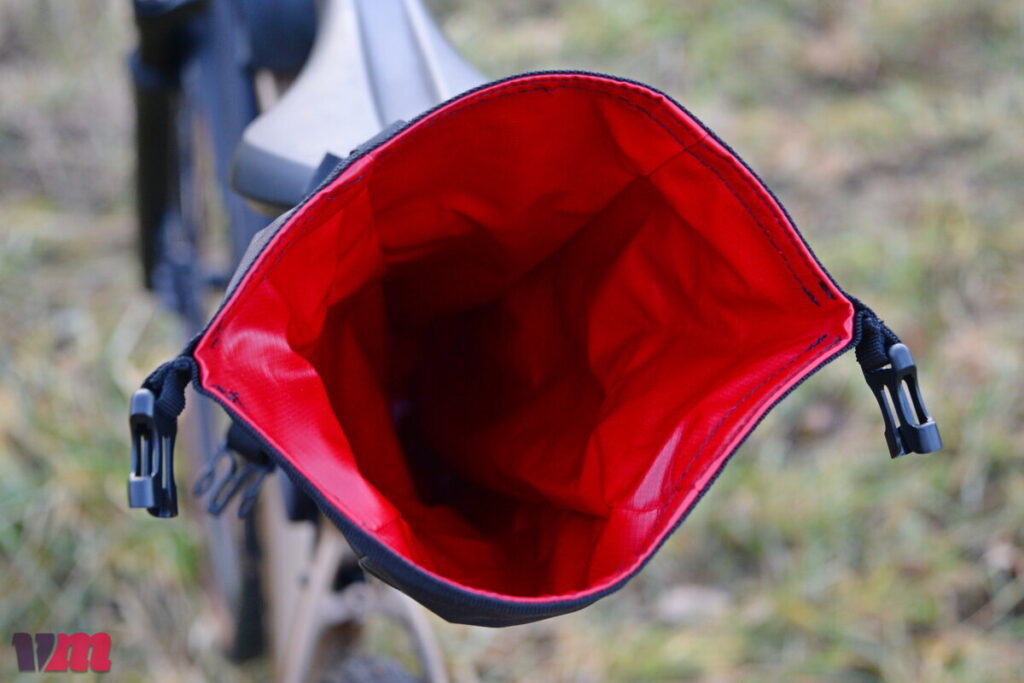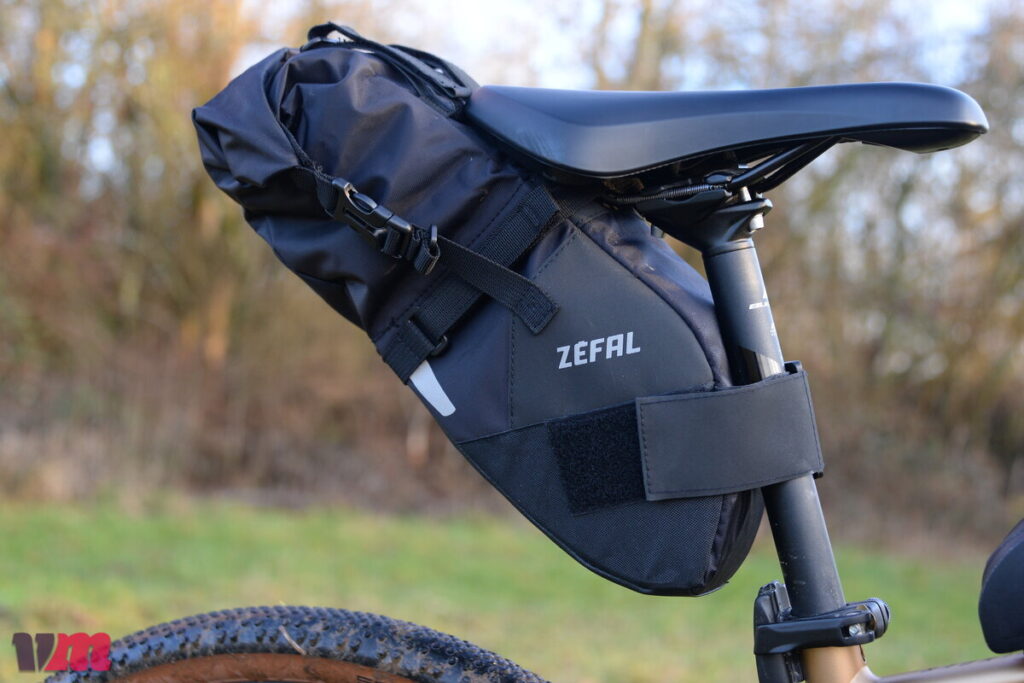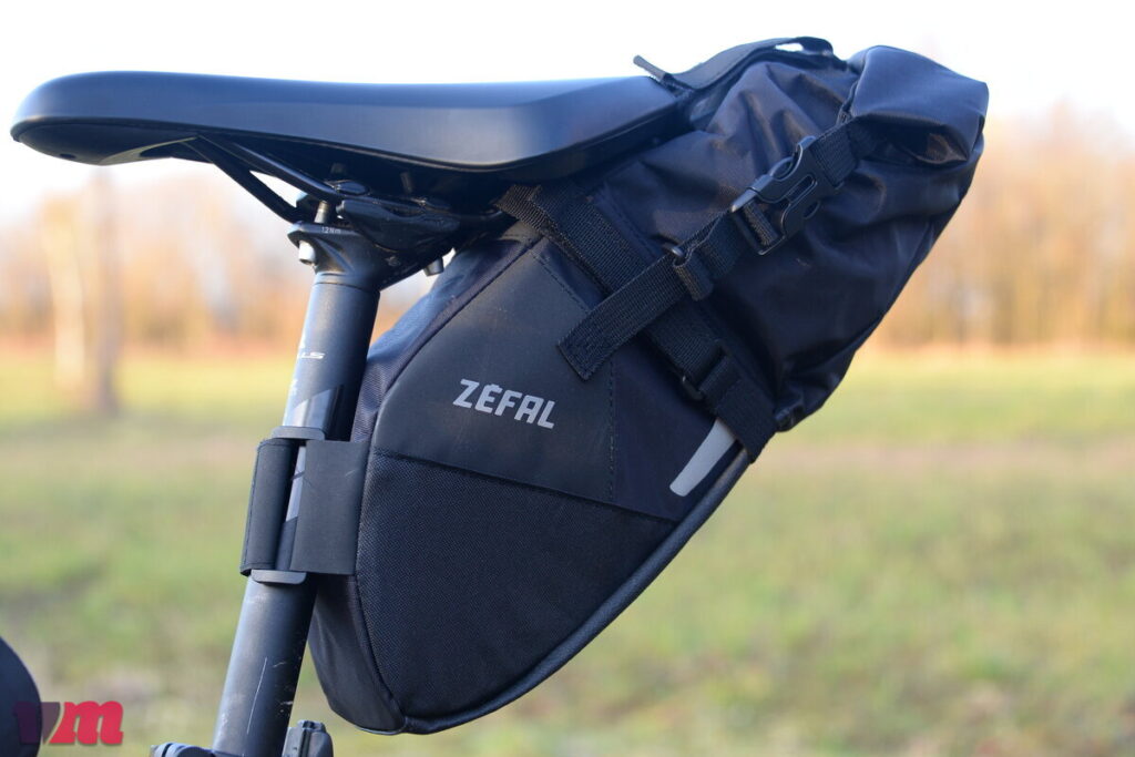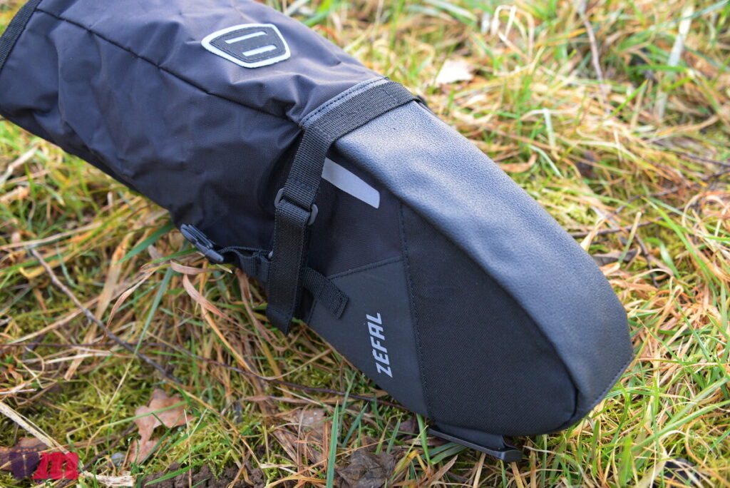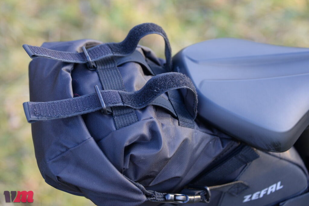 Bei der Z ADVENTURE R5 handelt es sich um eine kompakte, durchdachte Satteltasche, die robust konstruiert ist und einen langlebigen Eindruck vermittelt. Sie besteht aus hochwertigen, widerstandsfähigen Materialien, die auch bei längerem Einsatz zuverlässig schützen. Im Gegensatz zu den meisten Modellen im Testfeld wird die R5 ausschließlich über Klettbänder am Sattel befestigt, was die Montage unkompliziert macht, jedoch etwas mehr Aufmerksamkeit beim Fixieren erfordert als ein klassischer Schnallenverschluss. Besonders stabil wirkt die Tasche durch den verstärkten Unterboden und die Versteifung des gesamten unteren Rumpfes, sodass sie auch bei Fahrten über ruppige Trails ihre Form behält. Auf der Oberseite erlauben zwei Klettbänder das Befestigen von zusätzlichem Material, etwa einer leichten Jacke oder Regenhülle. Im Inneren ist die Tasche rot ausgekleidet, was das Auffinden kleiner Gegenstände erleichtert. Praktisch ist außerdem die Befestigungsmöglichkeit für ein Rücklicht. Die R5 fällt insgesamt eher klein aus, eignet sich also ideal für kurze Touren oder alle, die eine kompakte Satteltasche benötigen. Auf unserer Testfahrt hielt der Klettverschluss zuverlässig, die Tasche blieb fest an Ort und Stelle, allerdings sollte das maximale Gewicht von 3 kg nicht überschritten werden.