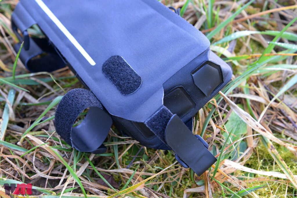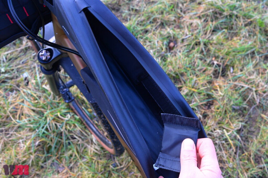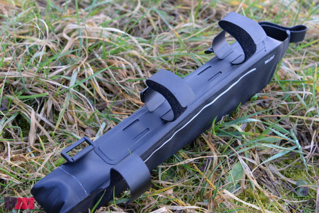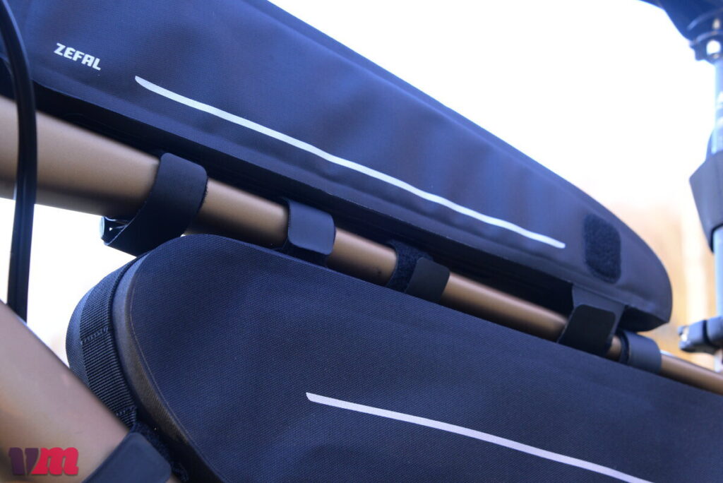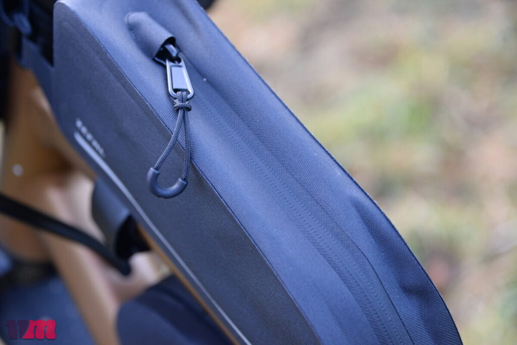 Die Zefal Z Adventure C3 Rahmentasche zeigt, wie auch die anderen Taschen der Z Adventure‑Serie, einen hochwertigen und robusten Aufbau, setzt aber auf ein etwas anderes Material als die Oberrohrtaschen. Statt klassischer Gewebe wie bei den Oberrohrtaschen kommt hier ein Polyester 600D TPU‑Material zum Einsatz, das besonders leicht, strapazierfähig und – zusammen mit verschweißten Verbindungen – wasserdicht ausgeführt ist. Die Konstruktion verzichtet auf stark versteifte Seiten, setzt stattdessen auf eine leichte Rundum‑Versteifung, die der Tasche Form und Stabilität gibt, ohne zu starr zu sein. Wie bei den Oberrohrtaschen gefällt auch an der Rahmentasche die variable Befestigung: Alle vier Fixierungspunkte lassen sich flexibel am Rahmen anbringen, sodass die Tasche auf verschiedensten Bikes sicher sitzt und nicht mit der Fixierung der Oberrohrtasche sich in die Quere kommt. Im Inneren bietet die C3 ein kleines Fach mit Reißverschluss und einen Schlüsselhalter, was den praktischen Umgang unterwegs erleichtert. Die Tasche ist übrigens in mehreren Größen erhältlich, sodass sich je nach Rahmenvolumen und Packbedarf passende Varianten finden lassen. Im Test hat uns die Rahmentasche sowohl im Handling als auch in der Performance überzeugt: schlicht, funktional und zuverlässig. Besonders positiv fiel die große Ziehhilfe am Reißverschluss auf, die das Öffnen der Tasche, selbst während der Fahrt, deutlich erleichtert.