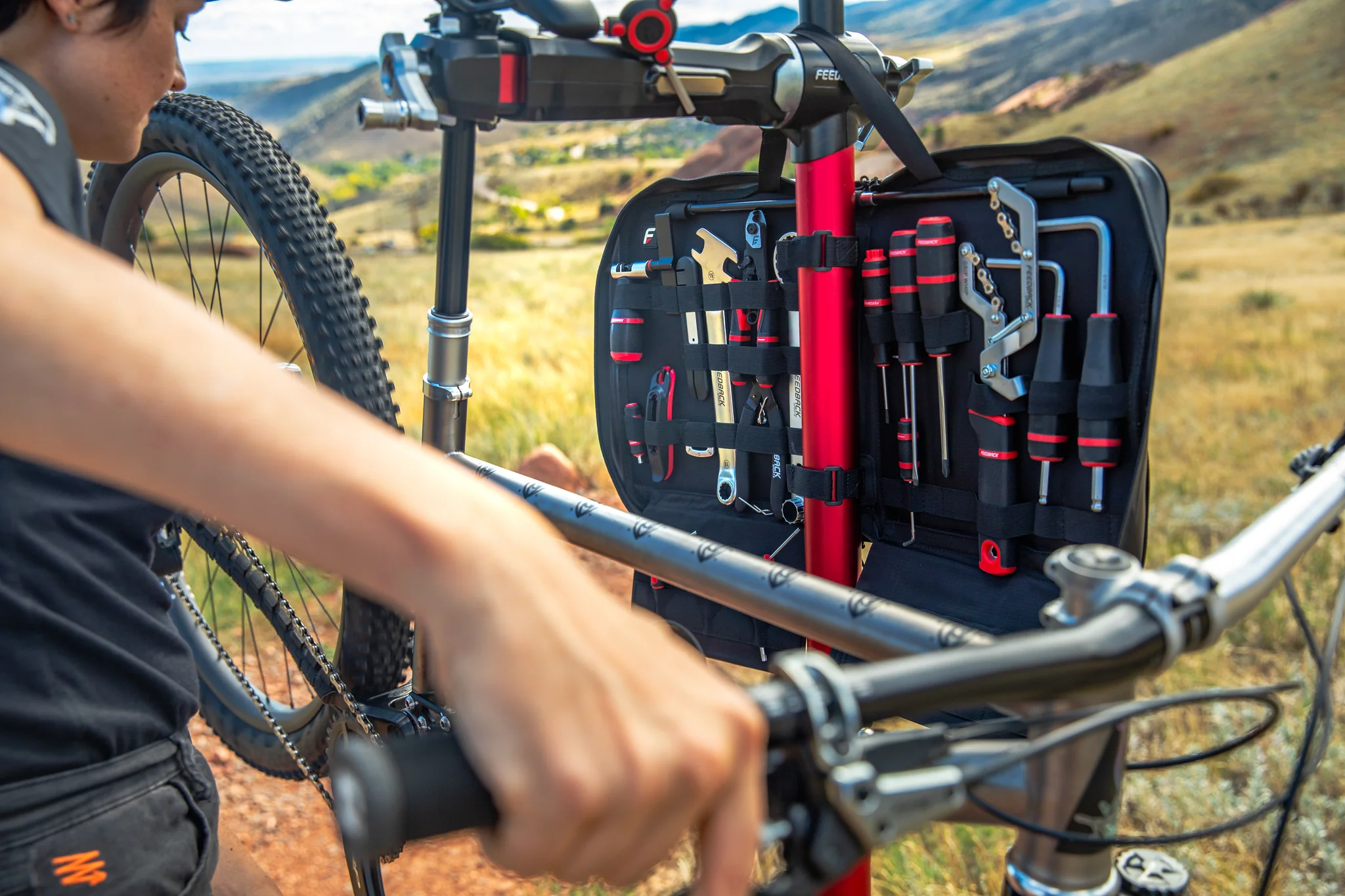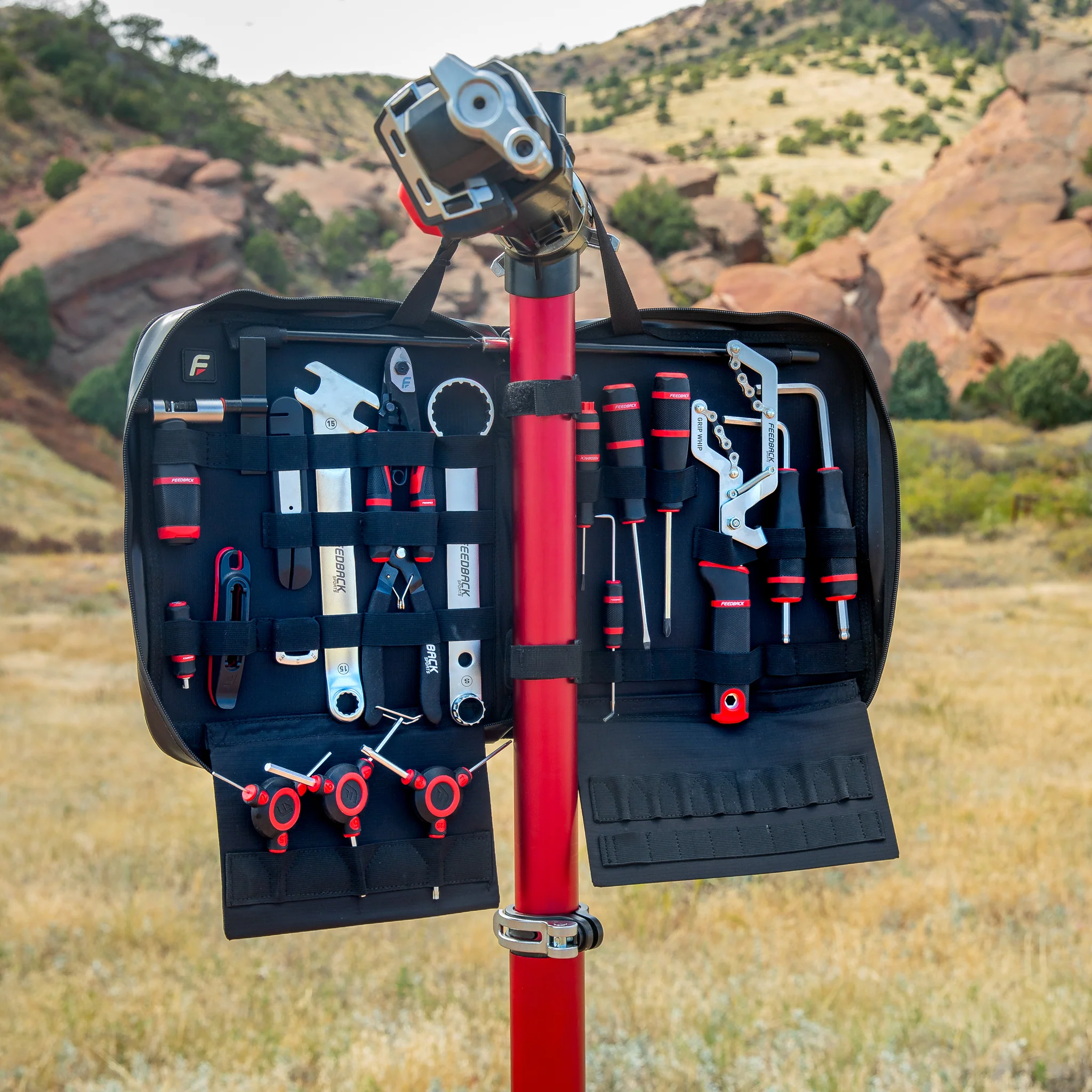 Feedback Sports nennt es den „ultimativen Field- und Home-Service-Partner“ – entwickelt mit Input aus Tour de France, Enduro World Cup und Downhill World Cup-Mechaniker-Kreisen. Das klingt nach Marketing, ist aber als Leitlinie spürbar: Hier wurde nicht versucht, eine Werkzeugkiste maximal voll zu stopfen, sondern die häufigsten Reparatur- und Wartungsfälle mit vernünftigem, hochwertigem Werkzeug abzudecken.