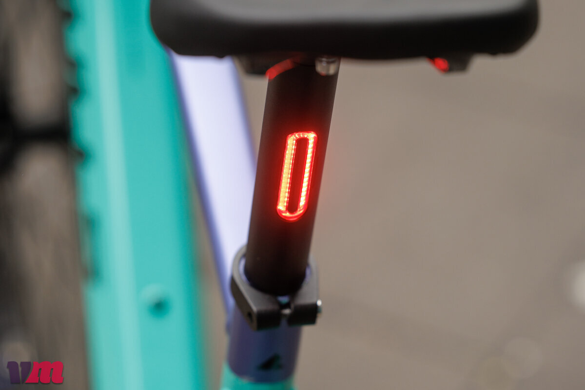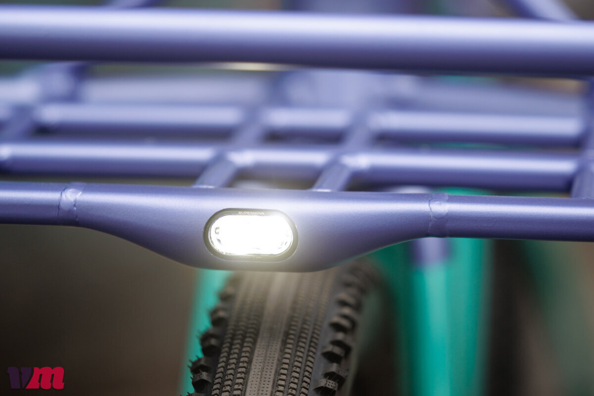 Etwas Besonderes hat sich Bulls auch beim Gepäckträger ausgedacht. Dieser ist nicht am Rahmen befestigt, sondern an der Gabel – genauer gesagt steckt er auf dem Gabelschaft und rahmt damit das Steuerrohr des Rahmens ein. Beim Lenken bewegt sich der Korb also mit, was auch deshalb wichtig ist, weil in den Träger eine kompakte, dabei sehr helle Frontleuchte (100 Lux) integriert ist. Dazu gibt es ein ebenfalls integriertes Rücklicht in der Sattelstütze, was auch wieder zur Korb-Idee passt: Die Kombination aus Rückleuchte in der Stütze uns Gepäcktransport hinten ist nämlich ziemlich ungünstig, da jegliches Gepäck das Rücklicht verdeckt.