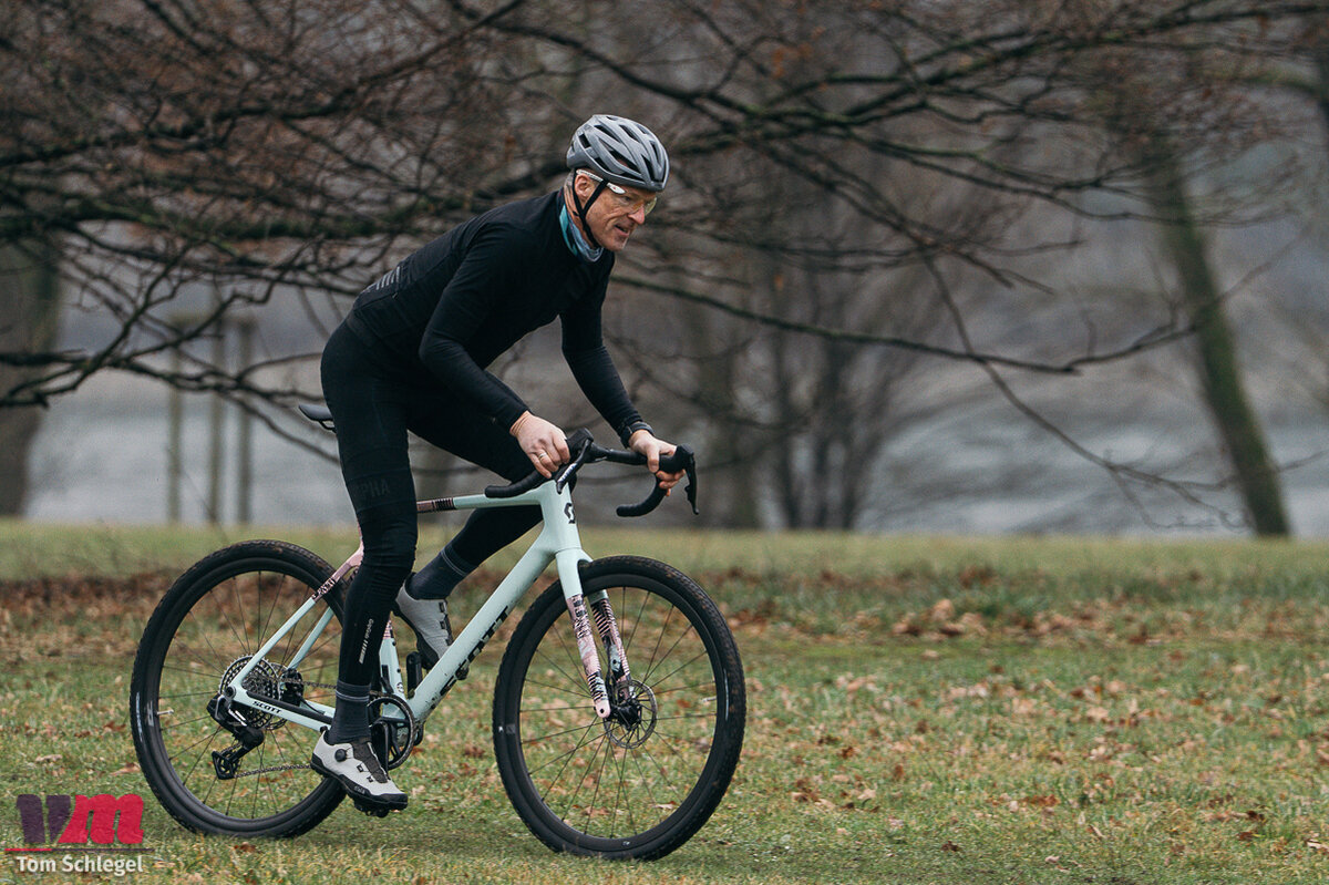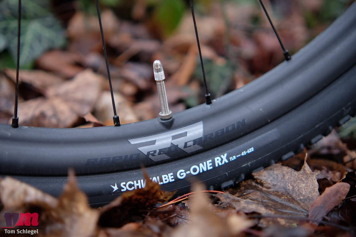 Scott stattet das Rad mit 45 mm breiten Schwalbe G-One RX aus, die natürlich ebenfalls zum Komfort beitragen, außerdem bei feuchtem Untergrund viel Sicherheit vermitteln. Auch ohne den Luftdruck allzu sehr abzusenken, beißen sich die Pneus auf der nassen Wiese fest und erlauben ordentlich Schräglage. Den hinteren Reifen gegen die Laufrichtung zu montieren, dürfte die Traktion weiter verbessern. Auf Asphalt überrascht der leichte Lauf der breiten Reifen, die am Testrad nicht eimal tubeless montiert sind. Insgesamt ist der G-One RX derzeit einer der besten Gravel-Reifen für Matsch und Nässe.
